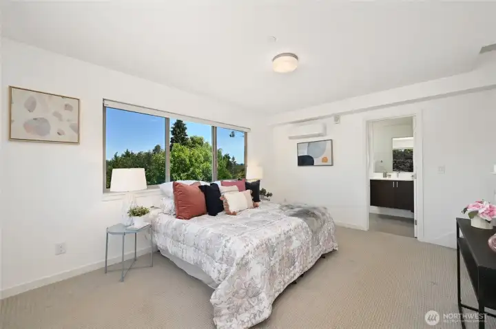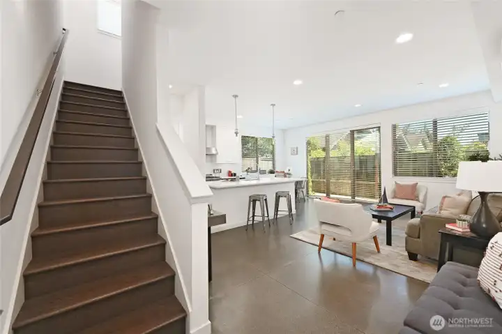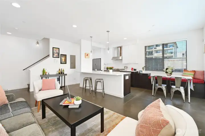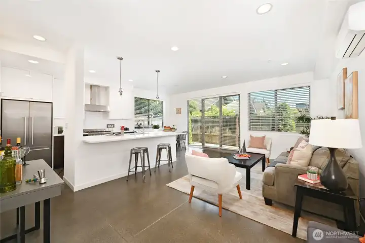 A beautifully kept, 2 bed 2 bath Sunset Hill home with the perfect combination of location and function. Clean, contemporary finishes in this rare, level entry to the main living space townhome. The main floor is filled with natural light from large windows and a slider door to a private patio. Enjoy an open layout with a large kitchen island, quartz counters, designer appliances, large pantry, built-in eating nook bench and polished concrete floors. Up a level to the 2nd bedroom with built in office niche and private deck. Full bath and washer/dryer on this floor. The upper level primary suite has a lavish ensuite bath, custom closet system and custom window coverings. Don’t miss the roof deck with convenient water and gas hookups plus mountain views to the Southeast! Enjoy a quiet, back corner unit, covered parking plus secure storage. Ballard and Golden Gardens just a stones throw away. A superb location in the heart of Sunset Hill’s village with its multiple cafés, shops, dining and pubs.