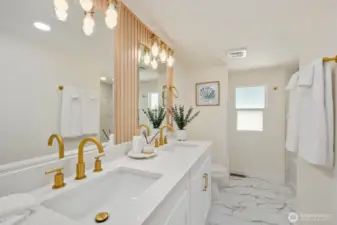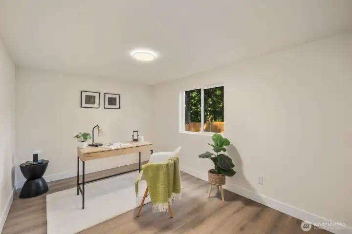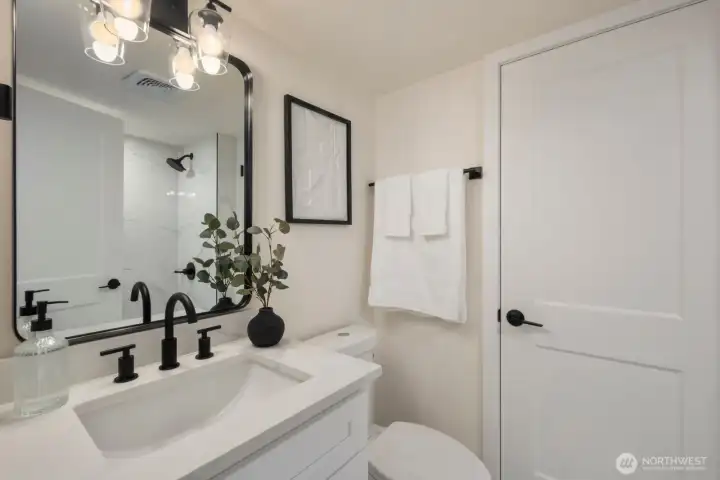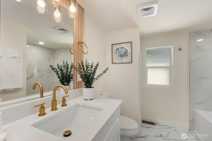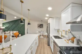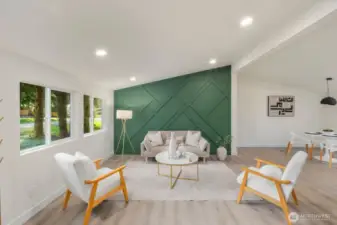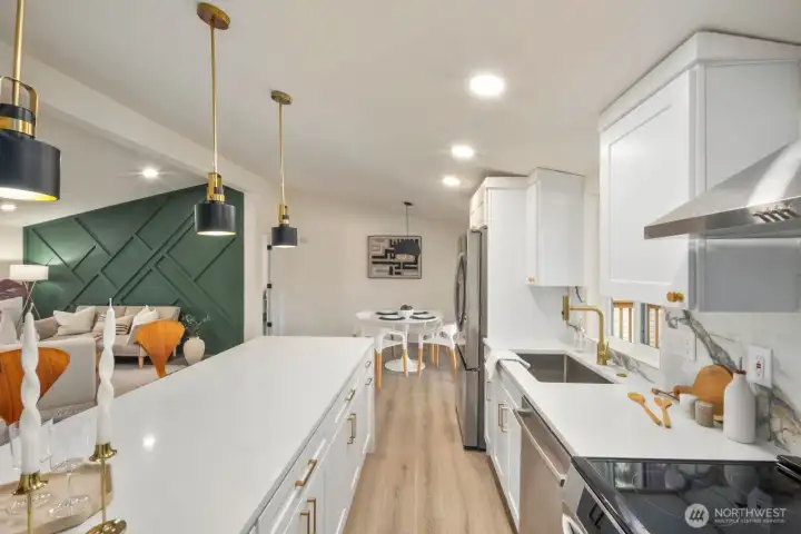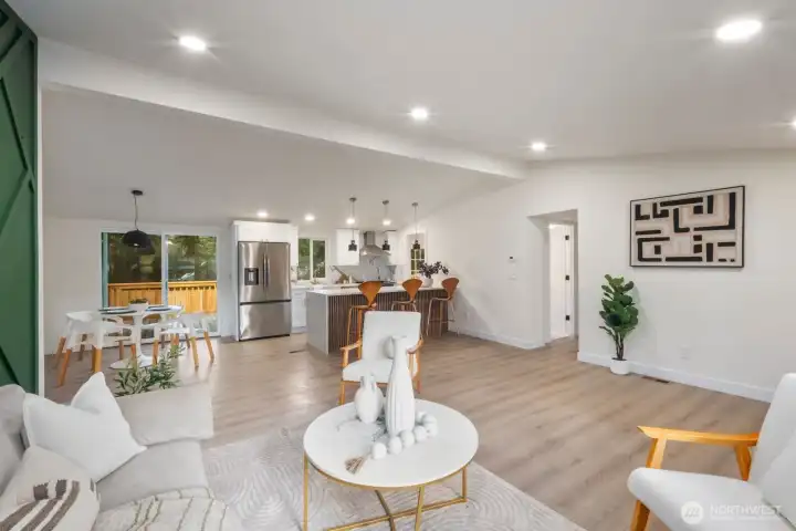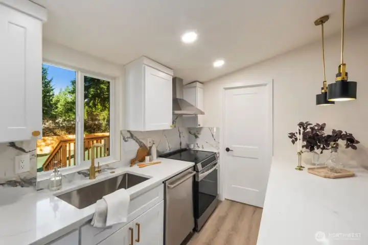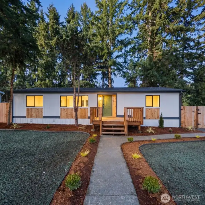 Fully reimagined and finished with intention, this beautifully remodeled 3 bed, 2 bath, 1,291 SF home rests on a private 0.29-acre lot framed by mature evergreens. A long driveway creates a striking approach and leads to gated access that opens for additional parking in the rear—ideal for guests, recreational vehicles, or added flexibility. Inside, vaulted ceilings enhance the open-concept design, filling the home with natural light and an airy, expansive feel. The kitchen is thoughtfully curated with high-end finishes, sleek cabinetry, stainless appliances, and a statement island designed for both everyday living and effortless entertaining. Wide-plank flooring flows throughout the main living areas, complemented by modern lighting and refined details at every turn. The primary suite offers a spa-inspired bath with elevated fixtures and clean, contemporary lines. Two additional bedrooms provide versatility for office, guests, or creative space. Step outside to the generous deck overlooking the fully fenced yard—private, peaceful, and ready for gatherings. A rare blend of thoughtful design, premium finishes, and usable outdoor space, all set on nearly a third of an acre.