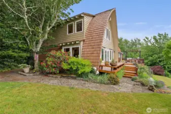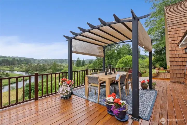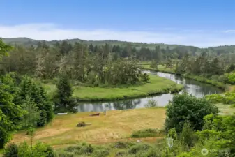 Discreetly nestled on 3 pristine acres along the South Fork, this exceptional custom riverfront estate embodies refined luxury, privacy, and breathtaking natural beauty in a serene setting. Designed with sophistication and comfort in mind, the main level features two expansive living spaces, an elegantly appointed chef’s kitchen with generous prep and storage, a formal dining room ideal for hosting, and a dedicated executive office—perfect for everyday living and effortless entertaining. Upstairs, four beautifully appointed bedrooms await, including a magnificent primary suite positioned to capture sweeping river views, offering a spa-inspired en suite bath with heated floors for a tranquil retreat. Outdoor living rivals a private resort, highlighted by an expansive deck with pergola and terraced landscaping that frames the river and lush surroundings, complemented by apple trees, blueberry and raspberry bushes, and a plum tree. Every detail invites relaxation and immersion in the peaceful rhythm of waterfront living. The lower field features a substantial detached shop, ideal for hobbies, storage, or a private workspace. Located just half a mile from the golf course and conveniently positioned between Seattle and Portland, this rare riverfront offering blends luxury, seclusion, and lifestyle—whether casting a line at sunset, kayaking the gentle current, or simply savoring the tranquility of nature.