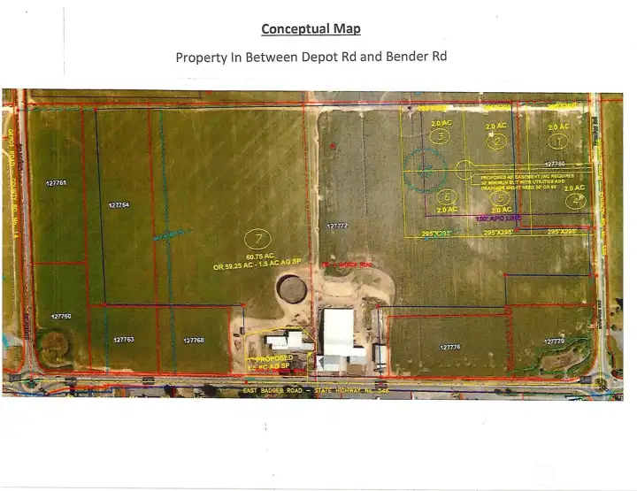 This map is a concept sketch of the development opportunities. This tract of land consists of 10 parcels. The potential exists, with lot line adjustments to create 6 residential lots that can be sold individually. Lot #7 on this map is a 4.72 acre lot with a cell tower that has a 40 year lease. Potential also exists for lot number 8 to carve off a AG short plot building site.