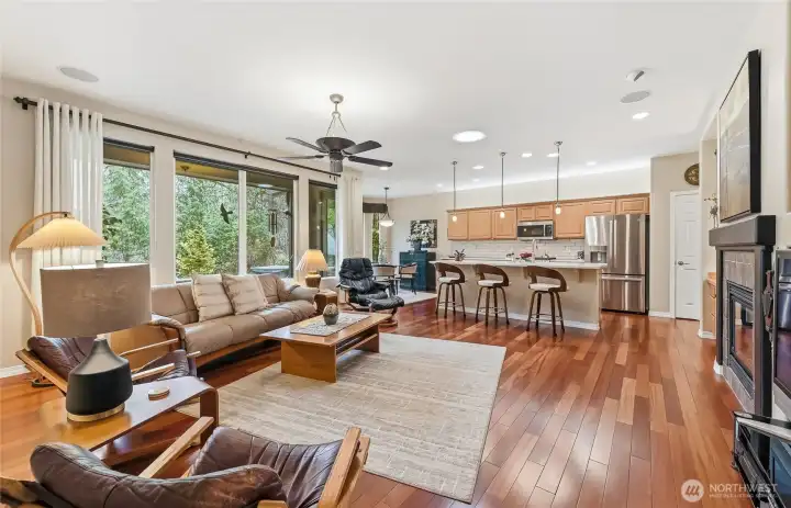 Experience extravagance daily in this meticulously maintained and tastefully updated Bainbridge plan located on a premium green belt in the forever young community of Trilogy. This flexible floor plan is an entertainer’s dream with its large, central great room plus formal dining room with an oversized skylight which lets in tons of natural light. Brazilian cherry hardwood flooring flows throughout the main living areas and large picture windows frame the serene green belt views. The updated island kitchen includes quartz countertops and newer stainless-steel appliances plus a casual dining nook. The great room flows seamlessly out to the large, private patio surrounded by mature garden beds, it’s the perfect space for relaxing on a summer day, outdoor dining or taking a relaxing soak in the hot tub. Spacious owner's suite with spa-like bath, the walk-in closet is finished with a Closets by Design organizing system. The guest bedroom has an adjacent full bath and is separated from the primary suite by the home office providing everyone with plenty of privacy. 2 Car garage with storage and an extended driveway that provides additional guest parking. Features include: Hubberton Forge light fixtures, Hunter Douglas blinds, custom draperies, solar tube skylights, surround sound. Fresh exterior paint. Central AC and New H2O tank. Trilogy amenities include clubhouse, gym, indoor pool, walking track, pickleball & tennis courts & miles of trails. 55+