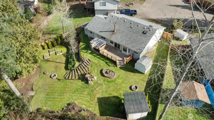 Tucked away on a quiet cul-de-sac, this move in ready 3bd, 1.75ba home offers 1,236 sq ft of comfortable living space on a generous .28ac lot. Inside, you’ll find a spacious living area, updated kitchen and bathrooms, and a primary suite with attached bath and ample closet space. A cozy wood stove keeps things warm and inviting through the colder months. Outside is where this property truly shines. The expansive backyard is designed for both relaxation and functionality, featuring a large deck, multiple fire pits, a swing lounger, hot tub, and raised garden beds. A large garage is ready for your workshop or hobbies; plus multiple outbuildings provide extra storage or project space.