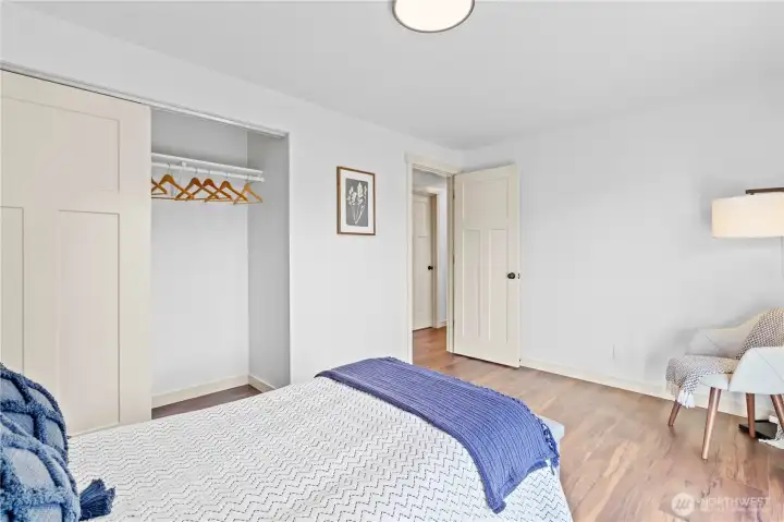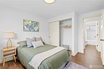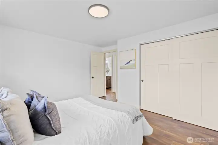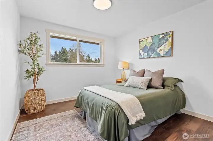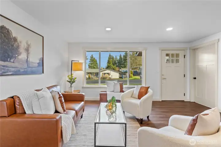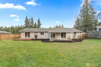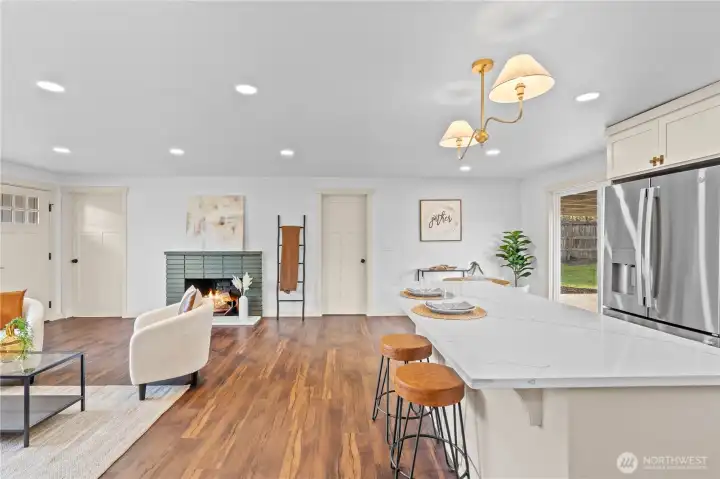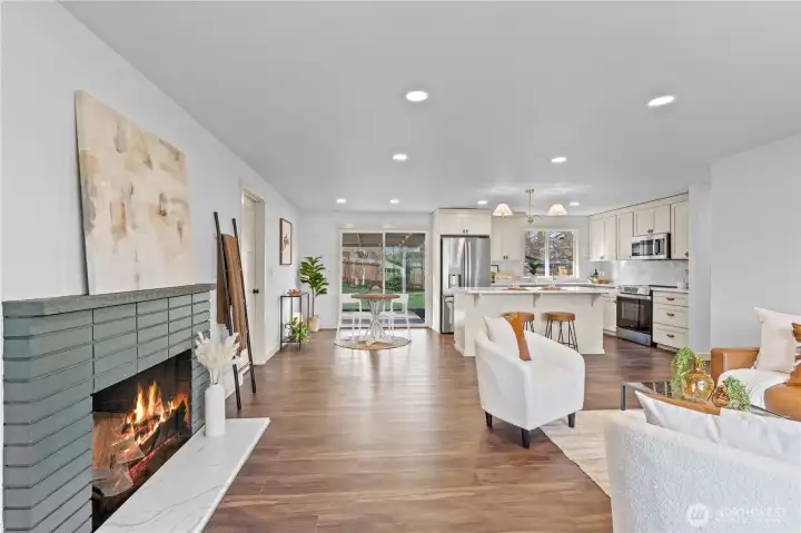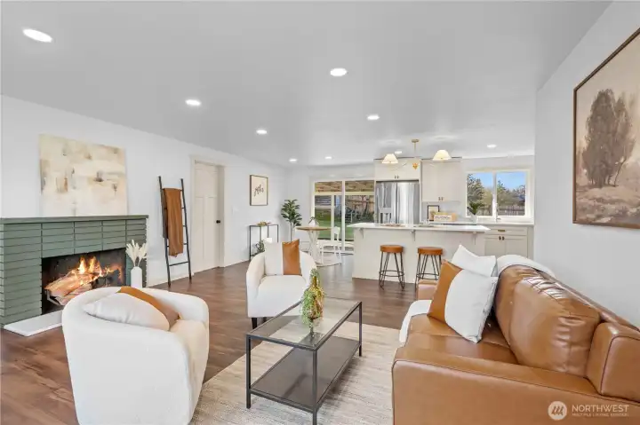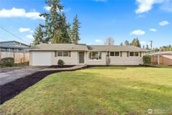 Oh so charming and ready to settle into, this beautifully refreshed 4 bedroom, 2 bath home blends cozy charm with upbeat personality. Featuring timeless accents, warm gold finishes, and a stunning light-filled kitchen at the heart of it all. A cohesive color story carries thoughtfully throughout the home, with exterior paint reflecting the interior kitchen cabinetry, doors, and trim & complimented by pops of emerald green showcased on the front door, exterior shutters and living room brick fireplace. The layout offers both flexibility and privacy, with one side functioning as a peaceful primary suite retreat. Three sliding glass doors create seamless indoor/outdoor living and open to a fully fenced backyard ready for slow mornings, summer dinners, and future garden dreams. Already home to a row of raspberries and a charming garden shed, the space invites you to grow something of your own. With fresh updates throughout, new bathrooms, and countless intentional details, this home is truly home sweet home.