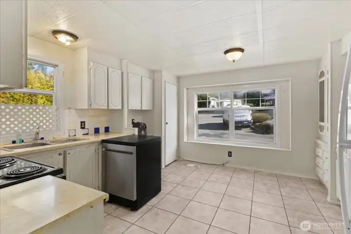 Opportunity knocks! Spacious living room, dining area and 2 bedrooms. Kitchen has eating area with large picture window to offer plenty of natural light. Built-ins and generous storage throughout, plus a large detached shed with electricity—ideal for hobbies or workspace. Tandem 3 car covered carport adds convenience. Corner unit gives plenty of privacy. Pet-friendly community near Alderwood Mall with easy access to I-5 and 405. Why rent when you can own for less? Bring your vision and make it yours! Amazing potential for sweat equity.