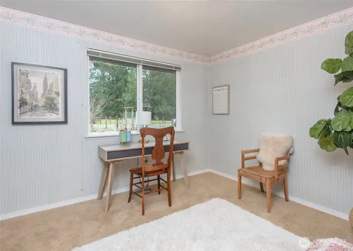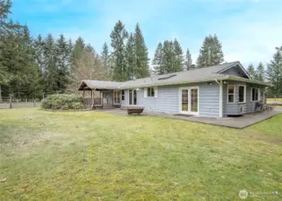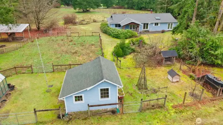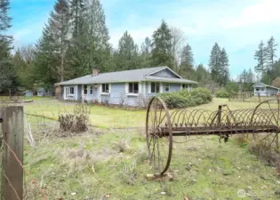 Welcome to this bright and inviting one-level home, featuring a remodeled kitchen with a farmhouse sink, modern finishes, and abundant natural light. The home offers three bedrooms, including a primary suite with a 3/4 bath, a full bath for guests, and a convenient 1/2 bath in the multi-purpose room, ideal for hobbies, an office, or extra entertaining space. Set on 5 acres of fully fenced, level land, this property is perfect for hobby farming, equestrian pursuits, or small livestock. Enjoy a 5-stall barn with tack room, a chicken coop/chicken hotel, greenhouse, utility/potting shed, and generous garden space for growing your own vegetables or flowers. A detached shop offers endless possibilities for woodworking, mechanics, or other creative projects. This is the perfect space for hands-on hobbies or storage. Step outside and wander the property, discovering unique yard art made from vintage farm equipment and collectibles, adding charm and character that make this home truly special. Inside, the wood-burning fireplace adds warmth and charm, while the covered deck with string lights creates an inviting outdoor space for entertaining friends. With ample room for animals, gardens, and outdoor hobbies, this property combines modern comfort with classic country lifestyle.