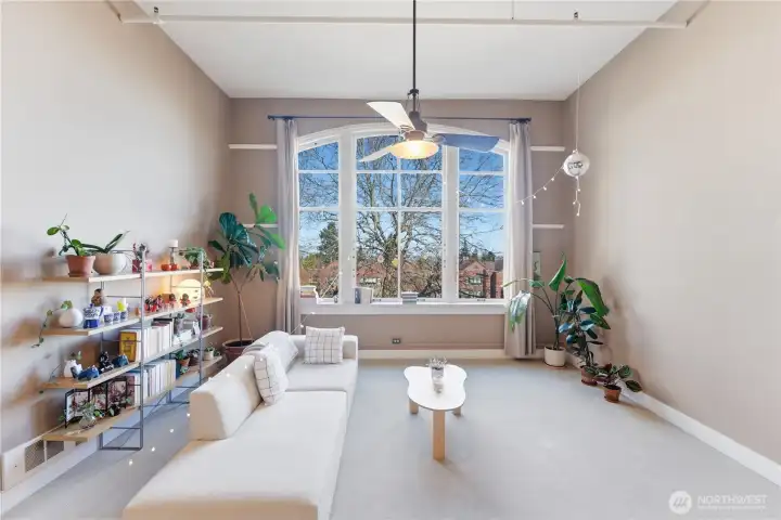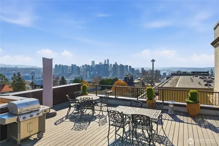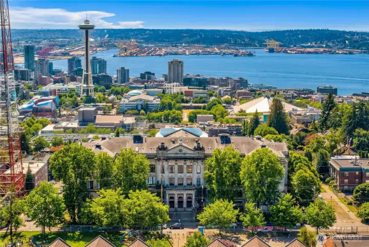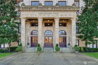 Experience timeless character and modern comfort in the iconic Queen Anne High School building, a celebrated Seattle landmark perched atop Queen Anne Hill. This spacious 1-bedroom residence impresses with dramatic 14-foot ceilings, expansive windows that flood the home with natural light, and a thoughtfully designed open layout ideal for both everyday living and entertaining. Historic architectural charm blends seamlessly with contemporary finishes, including granite countertops and stainless steel appliances. Residents enjoy access to the building’s renowned rooftop deck, offering breathtaking panoramic views of the city skyline, mountains, and Puget Sound—perfect for sunset gatherings and holiday fireworks. Pet-friendly and rental-friendly with no rental cap, making it an exceptional opportunity for both homeowners and investors. Located just moments from Queen Anne’s vibrant dining, boutiques, parks, and quick downtown access, this home offers the perfect balance of historic charm and urban convenience.