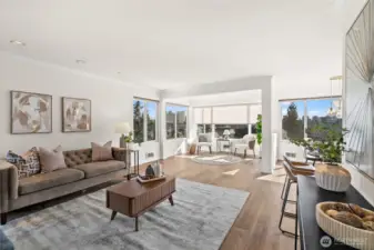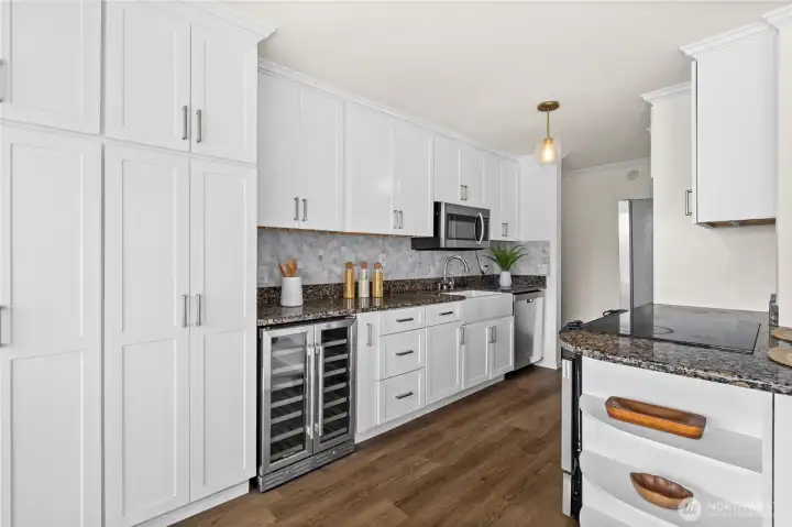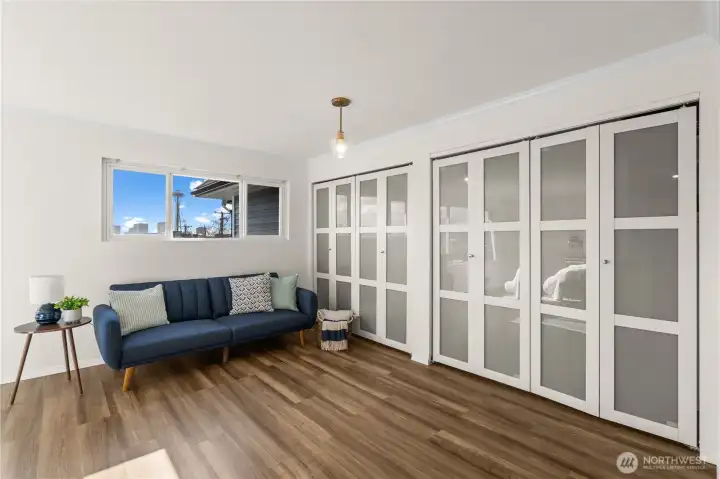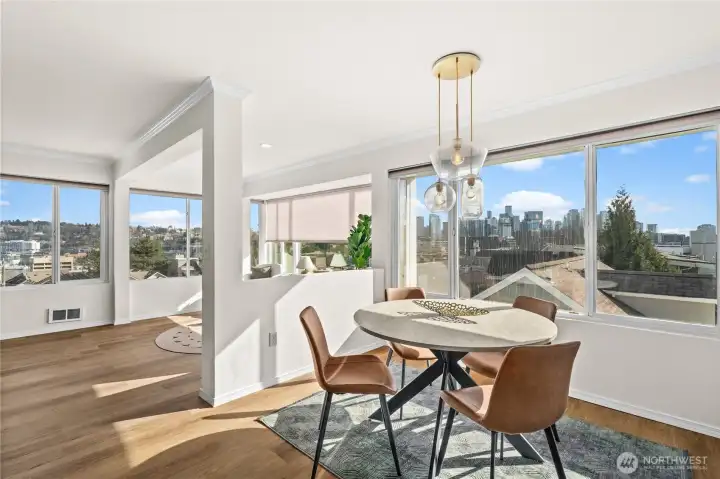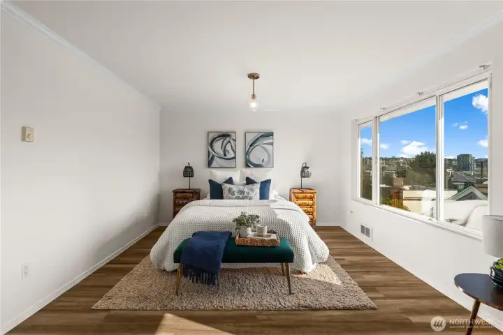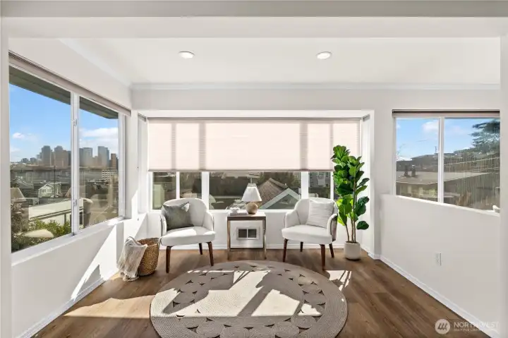 Enjoy spectacular city and lake views from nearly every room in this beautifully updated top-floor end unit in Queen Anne. Freshly painted with a new roof and siding, this spacious 2-bedroom, 1.5-bath condo offers peace of mind and style. The open kitchen features abundant cabinetry, stainless steel appliances, and granite countertops—perfect for entertaining or everyday living. The generous primary suite fits a king bed and dressers, includes an ensuite bath, and showcases stunning views of the Space Needle. The second bedroom includes a built-in office and a convenient Murphy bed for guests or flexible living. Two parking spaces and two storage units add rare convenience. No special assessments and no rental cap. Ideally located near Amazon, Meta, shopping, dining, and more—this home blends comfort, location, and iconic Seattle views.
