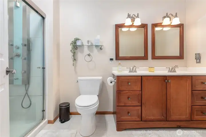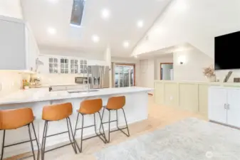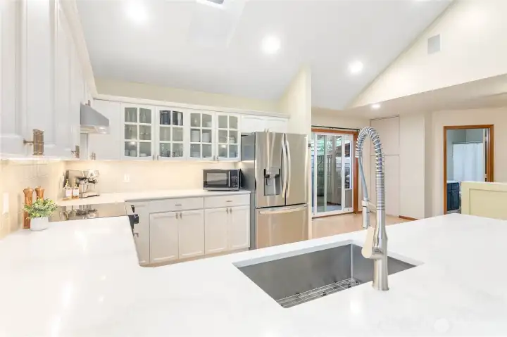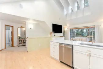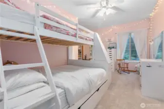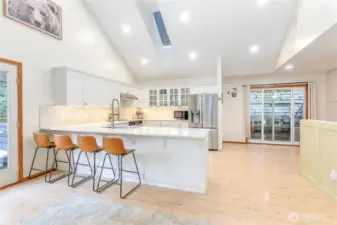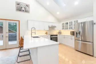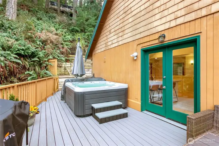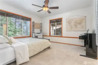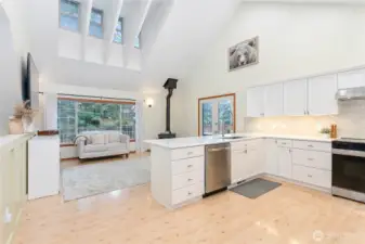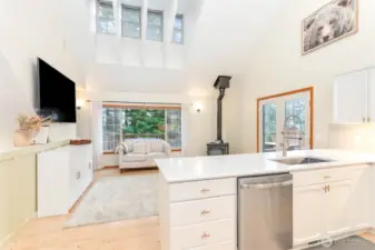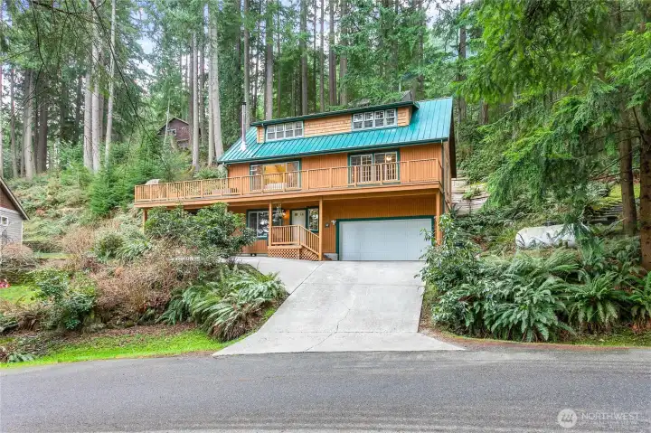 Tucked away at the end of a quiet cul-de-sac, this Northwest-inspired contemporary home offers a rare sense of privacy on a serene half-acre setting. Vaulted ceilings and walls of windows frame peaceful peekaboo Lakeview view, filling the open-concept living spaces with natural light. French doors open to a fully fenced, wrap-around deck—perfectly positioned for relaxing, entertaining, or simply enjoying the surrounding greenery. The flexible floor plan includes a spacious lower-level bedroom suite with walk-in closet, two additional bedrooms on the main level, and a bonus room on the upper floor—ideal for guests, work-from-home, or movie theater space. Outside, terraced garden areas and level spaces with play set invite outdoor play, gatherings, or quiet moments in nature. Located directly across from protected greenspace with trail access, this home offers immediate connection to the outdoors while remaining part of the vibrant Sudden Valley community. Enjoy access to lake beaches, marina, golf course, miles of trails, dog park, fitness center, pools, tennis and sport courts, plus nearby shops, restaurants, and the library—all just moments from your door.