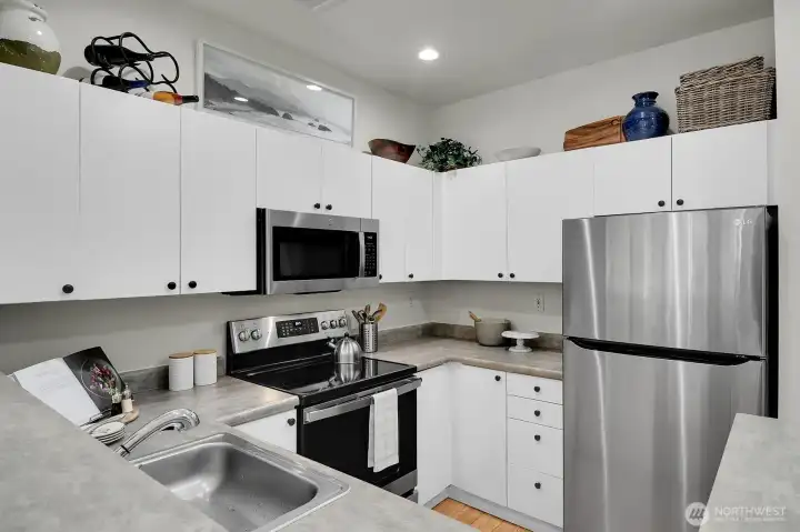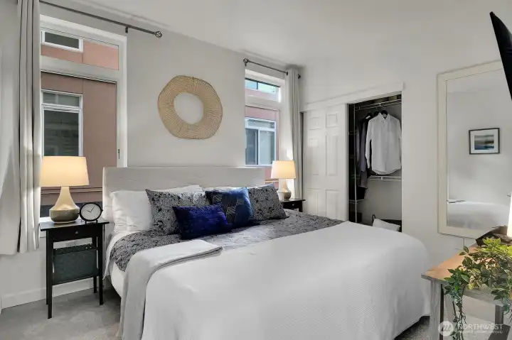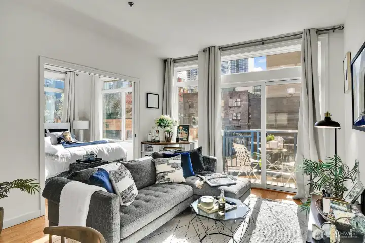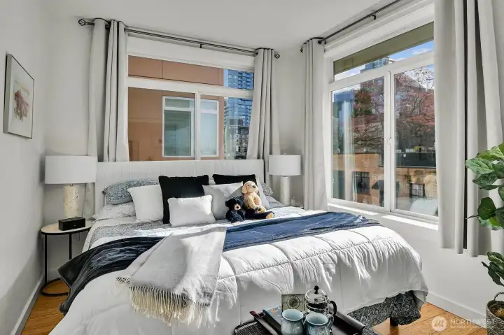 Experience the best of downtown living in ts sunlit end-unit 2-bedroom, 1-bath home at Belltown Court Condominiums. Ideally located in the heart of the neighborhood, this residence offers a rare blend of flexibility, comfort, and vibrant city access—including Airbnb potential for income or versatility. Inside, an open-concept layout features warm bamboo flooring and 2024 updates including new appliances, fresh paint & carpet, plus the convenience of in-unit w/d. The generous living area flows seamlessly to a private balcony with city views—perfect for relaxing or entertaining. Two well-proportioned bedrooms provide flexibility for guests, a home office, or both, creating an ideal urban retreat. Residents enjoy a full suite of hotel-style amenities, including a fitness center, indoor pool, spa, sauna, expansive view decks, concierge service, and a welcoming clubhouse. The building is secure and professionally managed with controlled access throughout and pet-friendly. This home also includes one secure parking space and additional storage—rare conveniences in the city core. Lush courtyard gardens, plus an on-site bakery/coffee shop and pizzeria, add to the lifestyle appeal. Just moments from Pike Place Market, the waterfront, Olympic Sculpture Park, Seattle Center, the Space Needle, top dining, nightlife, and major employers, this home offers city living at its finest.