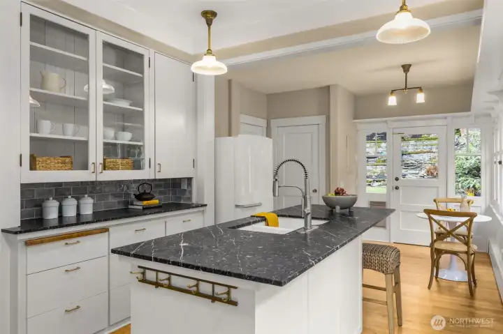 Just steps up from Lake Washington and bordering the restored Madrona Woods, this beautifully preserved 1915 Craftsman offers timeless character and exceptional livability. Classic details include a river rock front porch with lake view, box-beam ceilings, leaded glass built-ins, fireplaces and abundant natural light. Main level formal living and dining rooms flow into a spacious great room, where French doors open to a flagstone patio and terraced gardens creating effortless indoor-outdoor living. Friends will enjoy gathering here. Upstairs features the primary bedroom with window seat and lake views, three additional bedrooms, two baths and laundry. The light filled walkout garden level offers flexibility with a private entrance, bedroom, den, bathroom, full kitchen and ample exercise/storage space—perfect for guests, multigenerational living, or potential income opportunity. The backyard is a private retreat with two levels of flagstone patios bordered by lush gardens. An Asian-inspired spirit house overlooks the grounds, while a cascading fountain adds the soothing sound of flowing water. Madrona is cherished for its tree-lined streets, vibrant village shops and cafes, neighborhood parks and welcoming community. Enjoy morning walks through the woods, afternoons by the lake, and convenient access to downtown, South Lake Union and the Eastside. Experience classic Seattle architecture in a neighborhood defined by natural beauty and enduring charm.