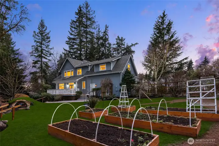 Winslow Haven Estate — a 5,349 sq ft designer-renovated custom residence on a rare two-parcel compound minutes to Winslow, waterfront, and the Seattle ferry. French white oak floors, custom cabinetry, fluted wood vanities, and curated lighting create a cohesive, elevated aesthetic throughout. Main-floor living and dining center on the chef’s kitchen with quartz counters, a Wolf range, and premium appliances. The living room features a fireplace with art niche and built-ins, while French doors off the kitchen open to a covered deck for year-round outdoor living. A main-floor bedroom offers a private entrance, and the reading room enjoys a wood-burning fireplace. Upstairs, the vaulted primary suite includes a spa-like bath with soaking tub, tiled shower, dual vanities, and heated floors. Additional bedrooms plus a flexible bonus room adapt for guests, fitness, or creative work. The 1,700+ sq ft lower level offers a private entrance, flexible second-kitchen area (wet bar / kitchenette—buyer to verify), bedroom, media room, infrared sauna, and designer bath—ideal for extended stays and flexible living arrangements. Enjoy the comfort of heating/cooling. Professionally landscaped grounds include a signature storybook garden cottage, raised vegetable beds, fruit trees, an evergreen grove trail, and a fire pit. The adjacent parcel at 885 Taurnic Pl NW offers future potential for a residence, guest house, or studio—buyer to verify feasibility and permitting. Welcome home!
