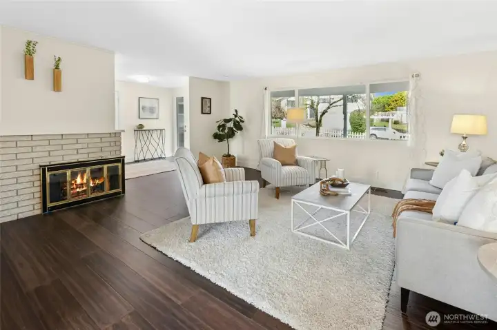 Exceptional Bothell rambler in an unbeatable location — just behind Maywood Hills Elementary and moments to downtown shops, dining, parks, and riverfront trails. This 4-bedroom, 2-bath home delivers instant curb appeal with a classic white picket fence, fresh professional landscaping, and inviting outdoor living spaces. Inside, the spacious open-concept layout seamlessly connects living, dining, and family rooms — ideal for everyday living and entertaining. Real hardwood floors throughout and two wood-burning fireplaces add warmth and character. Private primary suite with full bath. True laundry room. Large 2-car garage. Quiet dead-end street. Extensive recent updates include fresh interior paint, updated shared bath, new microwave, new garbage disposal, new backyard fence, painted front porch. Major systems already handled: 50-year roof (2007), 6-year water heater, serviced gas furnace, and updated windows. Move-in ready, thoughtfully maintained, and perfectly located — this is the total package.