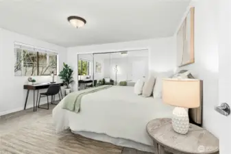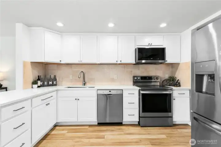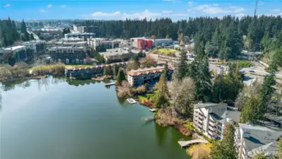 Top-floor corner unit with tranquil lake views and nearly 1,100 sq ft of beautifully designed living space! This light-filled 2-bedroom, 1.5-bath condo offers added privacy and comfort, featuring a spacious living room with a cozy fireplace and expansive picture windows that frame the serene setting. A large dining room provides the perfect space for gatherings, while the well-sized bedrooms offer flexibility and retreat. Fresh paint, new flooring, updated lighting, and a beautifully remodeled kitchen with modern finishes make this home truly move-in ready. Step onto your private deck to enjoy peaceful lake views, plus take advantage of elevator access, covered parking, 2 private docks for lakeside relaxation and a boat launch. Ideally located near shopping, restaurants, light rail, bus lines, and freeway access, with a well-run HOA for added peace of mind.
