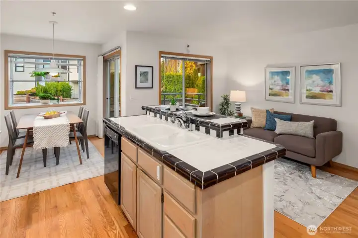 Live steps from the waterfront in this Houghton townhome, just moments to downtown Kirkland’s beaches, dining, parks, and boutiques. This light-filled 2,264 sq' home captures sweeping views of Lake Washington, Seattle skyline, and the mountains, paired with a thoughtfully designed layout spanning three levels. The main floor features a spacious living room with gas fireplace, formal dining area, powder room, and an open kitchen with eating space flowing into the adjacent family room. Upstairs, both bedrooms offer private en-suite baths, including a generous primary suite with its own gas fireplace. The lower level provides a flexible third bedroom ideal for guests or office along with a full bath and utility room. Two main-level decks and a rooftop deck create exceptional outdoor living and sunset-view entertaining. Attached 2-car garage offers outstanding convenience and storage. Well-managed, pet-friendly HOA. Dues include water, sewer, garbage, building and grounds maintenance, earthquake insurance, and reserve funding — delivering easy, lock-and-leave living. An unbeatable setting just half a block from the waterfront with effortless access to downtown Kirkland.