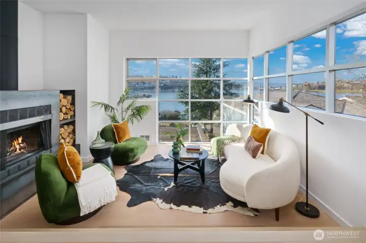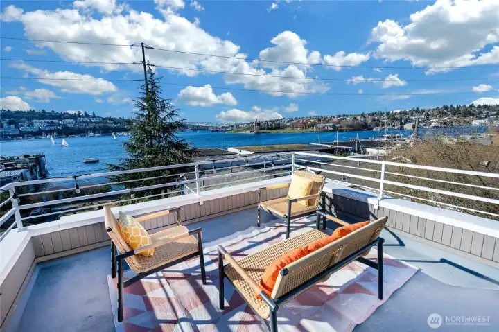 Eastlake waterfront is one of the city's most treasured & quaint neighborhoods. Come and see how locals experience a small-town beach life all while being in the heart of the city. Several beach pocket parks allow for sunbathing, SUP & kayak launch, bocce ball tournaments & picnics. Rogers Playfield serves as the hub for dog & playground aficionados alike...Pickleball/tennis, anyone? Pete’s Market has everything you may need plus an unrivaled wine selection. This rare & coveted floorplan is designed for enjoyment, inside & out. Unwind or host a July 4th fireworks watch party on the expansive rooftop deck. Western-facing views provide longer sunshine & exquisite sunsets. The open-concept top floor living ensures constant & dynamic daily views from early AM crew practice, summer sailboat races, Xmas ship parades, seaplanes & more, all from the cozy seat in front of your wood-burning fireplace. If it’s tranquility you want, step into your private, fenced garden oasis with enviable side yard for housing SUPs, kayaks or dog run. Garage plus add’l designated parking in front of unit means no compromises! Impeccably maintained & continually improved with hardwood flooring, custom Henrybuilt cabinets & wrought ironwork along with SubZero fridge & Bertazzoni range. The mini-split heating/AC system will keep you comfortable all year round. This light-filled end unit enjoys secure corridor views with a far superior floorplan, garden & parking than you’ll find in the newbuild townhomes.