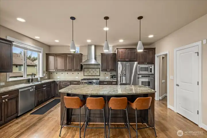 Spanning across three thoughtfully designed levels, this 6-bedroom, 3.75-bath luxury home offers the rare combination of refined finishes, flexible living spaces, and genuine privacy. The chef’s kitchen features premium Dacor and Bosch appliances, two full convection ovens, slab granite countertops, and a dry bar, all open to a generous Great Room built for entertaining. A covered patio just off the kitchen extends your living space outdoors. A secret door reveals a hidden bonus room perfect as a whiskey room, collector’s space, or extra storage. The owner’s suite features a spa-like bath and an enormous custom walk-in closet by California Closets. The fully finished lower level includes a game room, recreation area, wet bar, and a private bedroom with kitchenette, making it a great option for guests or multigenerational living, with real potential as a mother-in-law suite. A main-level den offers a flexible 6th bedroom option. Upstairs, a bonus/media room rounds out the space. Double-paned, argon-filled windows provide comfort and energy efficiency year-round, and central A/C keeps every level cool in summer. The three-car garage includes wall-to-wall matting and a Tesla EV charger. The fully fenced private yard features raised garden beds and is designed for privacy and outdoor living. Easy access to Seattle, Bellevue, Sea-Tac, and Southcenter.