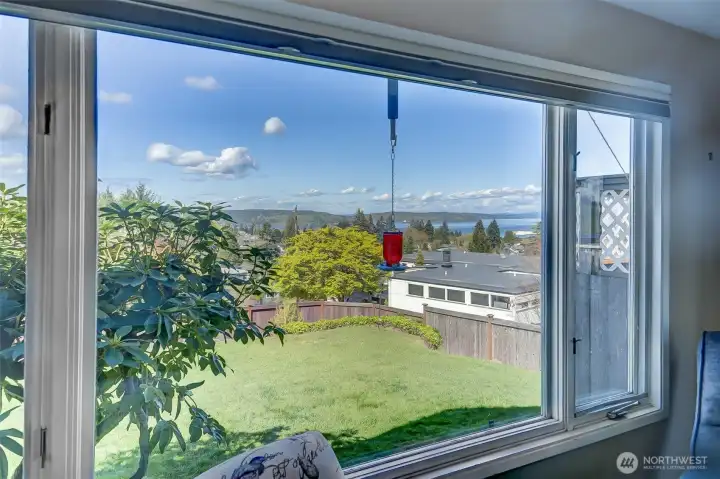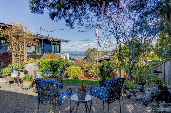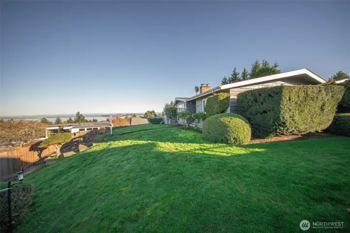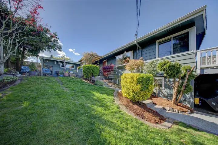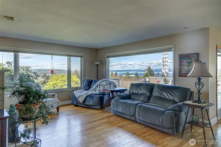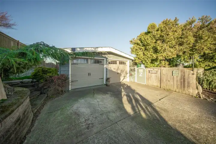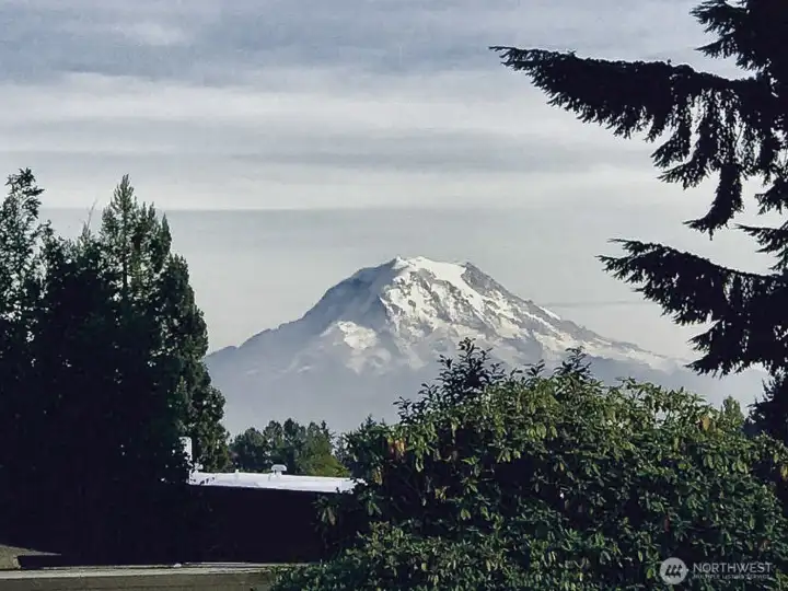 This stunning view home in Tacoma's desirable North End. Easy walking distance to Point Defiance Park (760 ac: trails, zoo, aquarium, beaches), modern Point Ruston waterfront & vibrant Tacoma waterfront. Elevated above lower rd, the home captures panoramic views of Mt Rainier & Commencement Bay from multiple angles—serene backdrop that shifts w/ seasons & time of day. 2-car garage + dedicated RV parking pad. Gated, fully fenced backyard oasis: spacious patio ideal for BBQs & entertaining, lush gardens. Front yd features expansive lawns, trellised garden spaces, & sprinkler system. Wide staircase to large view deck—perfect for morning coffee, ample room for seating/tables. Glass French drs open from deck to dining area, blending indoor/outdoor living. Kitchen w/ sleek granite counters plus modern SS appliances. Adjacent large living rm: flooded w/ natural light from huge windows on 2 sides framing incredible views. Substantial Fire Place anchors the space w/ built-in elec wiring for TV/internet. Main flr primary bedroom: peaceful retreat w/ French door access to private patio & side yd. Main flr bath bath w/ dbl vanities & shower. Original 1956 hardwood floors flow throughout main level, adding timeless character. Lower level: separate family rm perfect for movie nights, game days, or cozy hangouts; remodeled bath; add'l bdrm (flex for guests or office). Thoughtfully updated while retaining unique mid-century vibe. Quiet comfort in one of Tacoma's great neighborhoods.