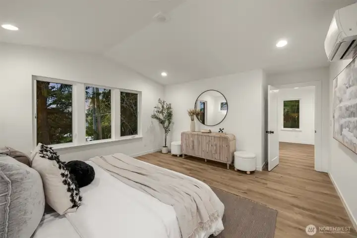 A calm, comfortable primary suite retreat with designer finishes and oversized windows.