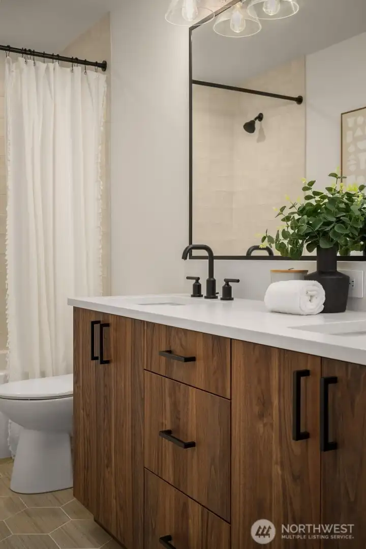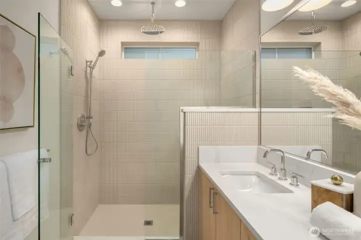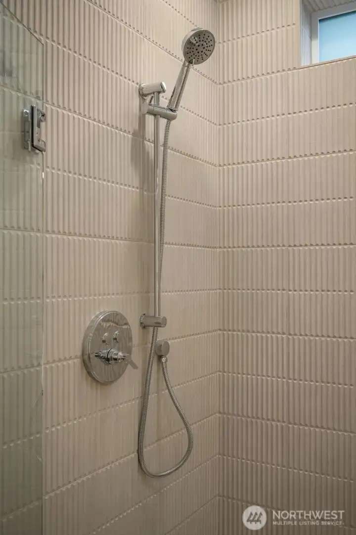 Spa-inspired primary bath with heated floors and thoughtfully selected tile.