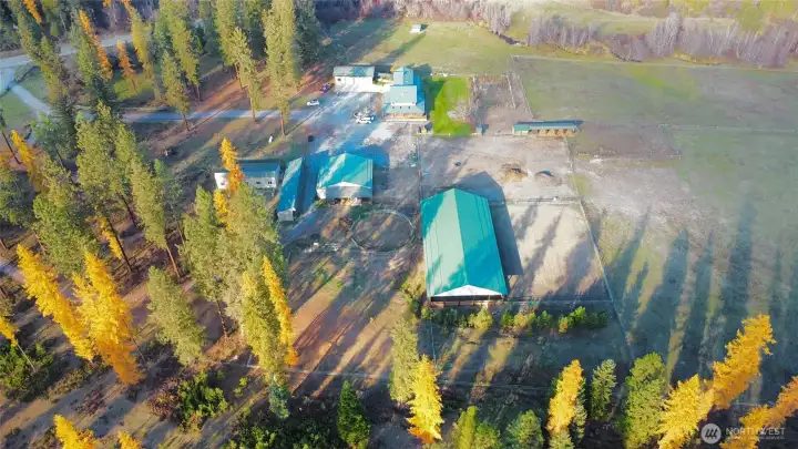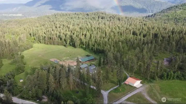 Stunning creekfront equestrian estate with private FAA-certified airstrip and two residences on 46.69 fully fenced acres in Northeast Washington. Crown Creek Ranch blends luxury living, aviation access, income potential, and turnkey horse facilities—ideal for equestrians, private pilots, outdoor enthusiasts, or those seeking a secluded retreat. A year-round creek flows through wooded riding trails, open hay fields, and abundant wildlife, secured behind a gated keypad entry. The 3,400-square-foot custom main home offers open-concept living centered around a chef’s kitchen, dual primary suites including a main-level suite with radiant heated floors, three travertine baths, private office, gym/flex room, and spacious laundry. An expansive wraparound Trex deck and screened porch create seamless indoor-outdoor living. Multiple heating and cooling systems, whole-home generator, private well with 3-stage filtration and UV, and a breezeway to an extra-tall 3-car garage. The 1,200-square-foot bunkhouse sleeps 10+, features 3 baths, full kitchen, separate septic, leased propane tank, and has operated as a successful Airbnb. Equestrian amenities include a 120x60 lighted indoor arena, outdoor arena, round pen, five-stall barn with heated tack room and wash station, cross-fenced pastures, loafing shed, hay field, and equipment shed. The ½-mile gravel airstrip leads to a 40x50 hangar with Schweiss bifold door. Near Red Mountain, Northport, and state land, this is a rare NE Wa. offering.