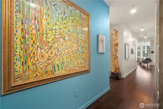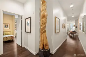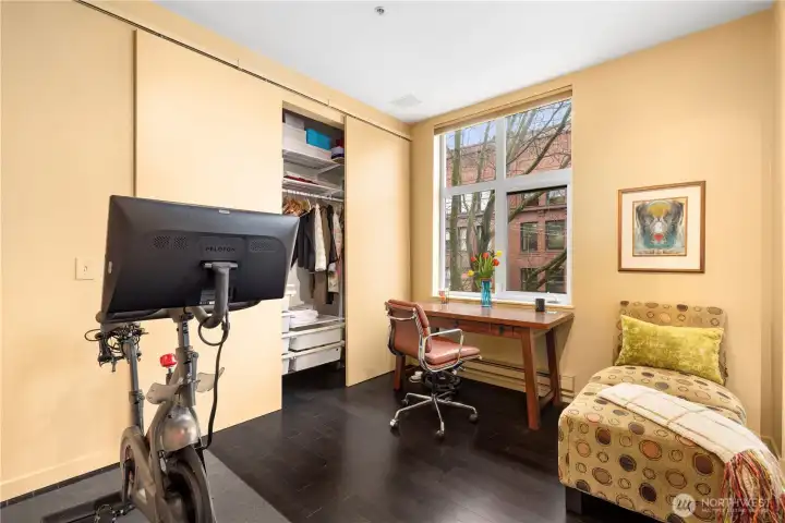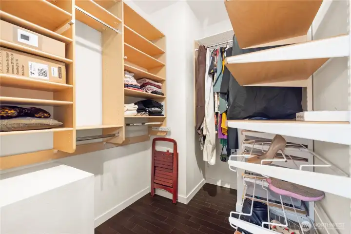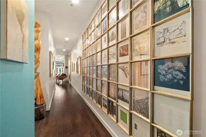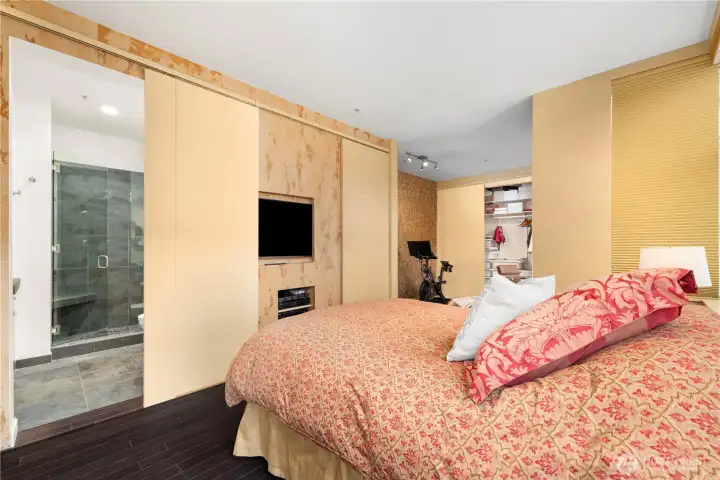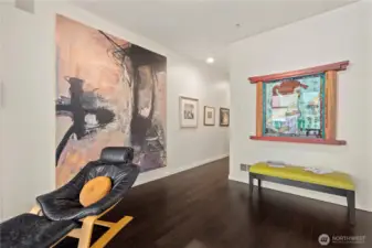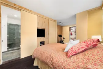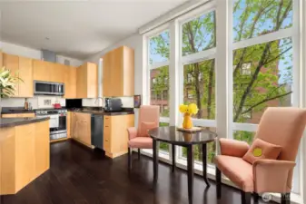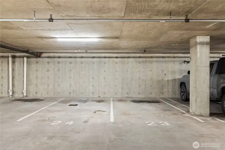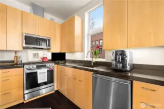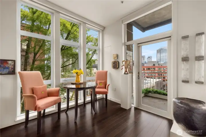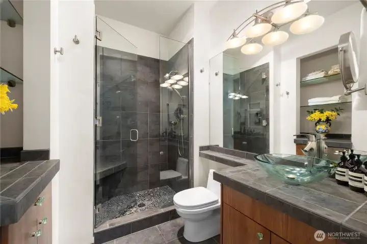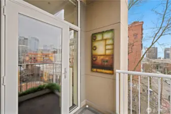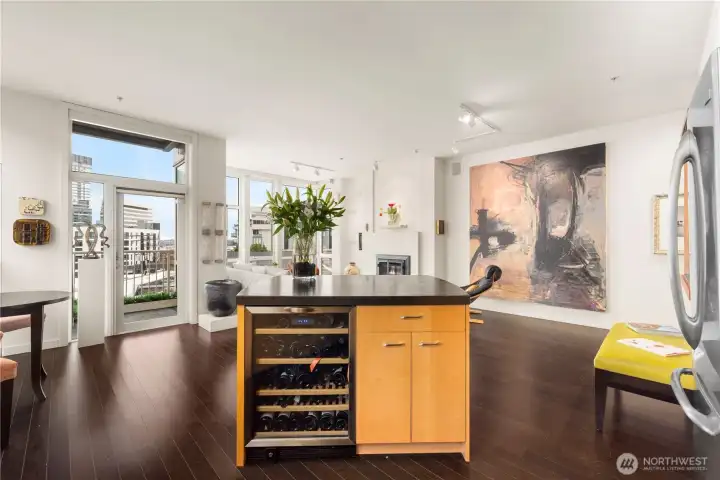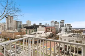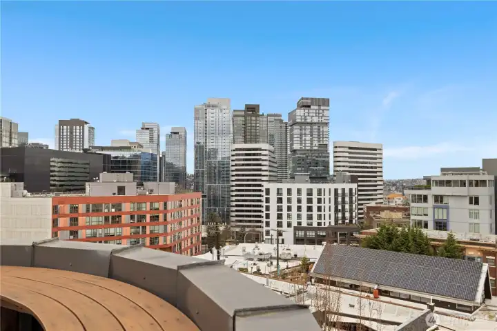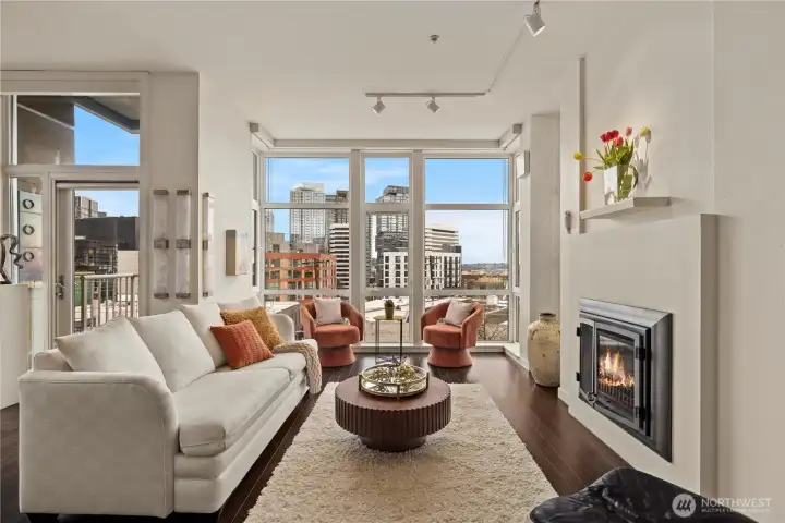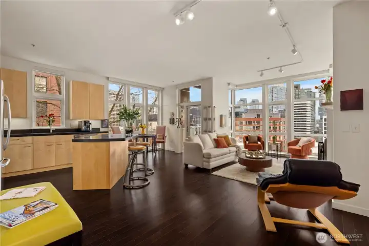Incredible spacious 5th floor home with vibrant Seattle Skyline views! Sophisticated, sexy, sleek, modern loft style home. Corner end unit with windows on 2 sides, for wonderful light and cross breezes. Enormous windows and 9+ foot high ceilings create a gallery-style space. Generous, open living. Stunning espresso stained hardwood throughout. Gorgeous kitchen with Dogpaw Design concrete, newer appliances (LG ThinQ gas range with air fryer, beverage fridge, GE profile fridge, Bosch dishwasher, full size LG stack W/D with dry cleaning feature). Fantastic quiet neighborhood. Lavish primary suite with fantastic walk-in closet, fabulous subtle hand painted wallpaper and electronic black out shades. Primary bath features Italian ceramic, pebble floors, shower niches, 2 headed shower. Newer White Haus dual flush toilet. Designed and built as a 2 bedroom, owner removed a wall for one stunning open concept bedroom suite with office space and room for exercise. Yacht doors conceal flat screen TV that stays. Space can be converted back to 2BR. Sweet deck with captivating views for enjoying morning coffee and evening sunsets. Striking 2nd bath with gorgeous glass tile, candle shelves, bathtub and rain shower head. Built in speakers throughout home. 2 full size parking spaces side by side, and a private storage unit. Welcome to Pike Lofts-a beautiful secure condo offering a cool vibe and perfectly situated between Downtown & Capitol Hill for the best of in-city living! Turn key, move in!