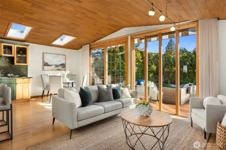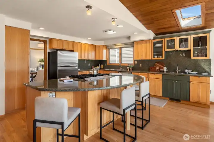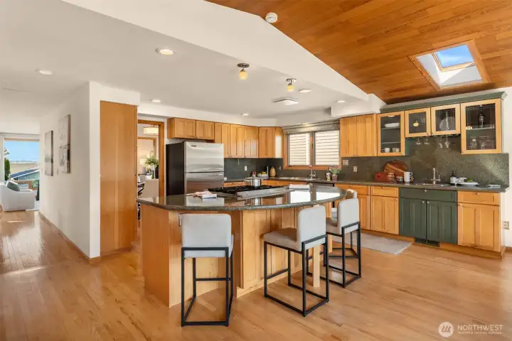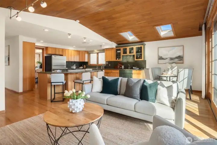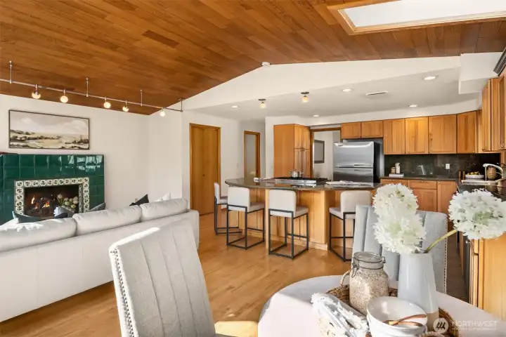 Welcome to one of West Houghton's finest addresses — a serene cul-de-sac where breathtaking west-facing views of the snow-capped Olympic Mountains and spectacular evening sunsets greet you daily. The Cross Kirkland Corridor trail entrance is just half a block away, and Houghton Beach Park, Carillon Point's marina and waterfront restaurants, Lake Washington, Google Campus, downtown Kirkland, Metropolitan Market, and Lakeview Elementary are all within blocks.Inside, a fully reimagined primary suite stuns with spa-caliber bath, custom ceramic tile, and an expansive walk-in closet with built-ins. The updated kitchen features a large island and professional Viking 6-burner gas cooktop, opening directly to a generous deck and a beautifully private backyard — flat, fully usable, with a lush grass lawn, mature landscaping, and built-in garden space perfect for the avid grower. Three gas fireplaces add warmth and ambiance throughout. Downstairs, a bedroom, ¾ bath, and oversized rec room offer compelling MIL conversion potential. Light, airy, and lovingly curated — this one is special.