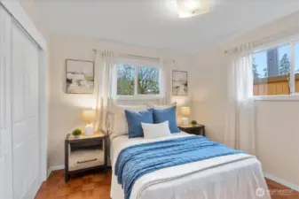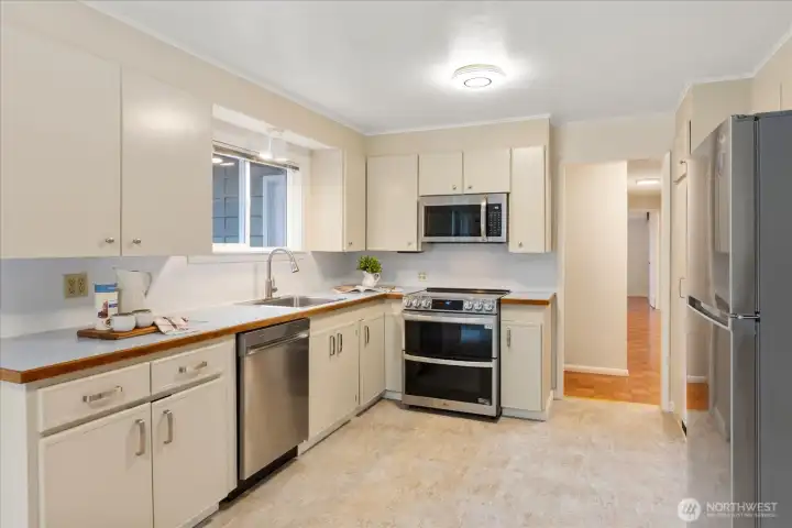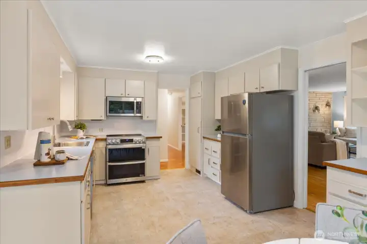 Tucked back off of a quiet street, this mid-century modern rambler offers space, privacy, and endless possibility. Set on a huge, 18,000sqft fully fenced lot surrounded by fruit trees, flowering shrubs and edible berries. This home is filled with natural light and serene views from every window. Spacious living and dining areas center around a cozy wood-burning fireplace—ideal for gathering or quiet evenings in. The refreshed kitchen features new LVT flooring, all new appliances, and space for a breakfast nook overlooking the peaceful patio and visiting wildlife. Enjoy year-round comfort with new mini-splits throughout providing efficient heating and cooling from room to room. Newly installed TPO (Thermoplastic Polyolefin) roof complete with added insulation for peace of mind. With its NR3 zoning, the expansive lot offers exciting DADU or future build potential (buyer to verify). Large shop/studio with electric heat and a two-car garage add versatility for hobbies, storage, or creative space. Conveniently located near sought-after Boeing Creek Park and Sunset Park and within the Shoreline School District. A rare opportunity to live, expand, and create your vision. This home has been pre-inspected and sewer scoped.