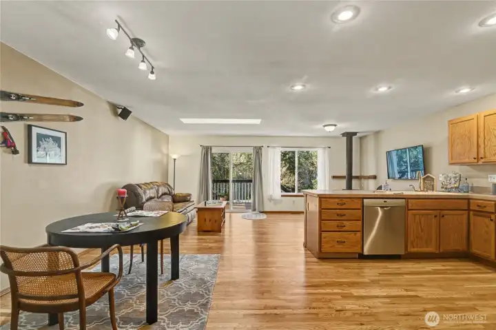 Welcome to Carlyon Beach, a waterfront community! This charming 3-bedroom, 1.75-bath home offers 1,454 sq ft of living space on a single-level. Enter into a quiet, cozy living room—perfect for unwinding at the end of the day. Open-concept family room is waiting to entertain. Filled with natural light, this room showcases beautiful hardwood floors, skylights, & a cozy wood stove for those cooler evenings. Spacious kitchen offers a breakfast bar, newer SS appliances & ample storage. The cozy dining space beside the kitchen is ready for meals or game night. Just off the family room a deck extends your living space outdoors to the backyard—great for summer BBQs or peaceful evenings. The primary suite with a private 3/4 bath will not disappoint. Private deck off the bedroom is a nice retreat for morning coffees and bird watching. Don’t miss the opportunity to enjoy life by the water in this wonderful community. Located just a short distance to the waterfront park, marina, and boat launch.