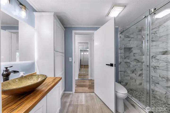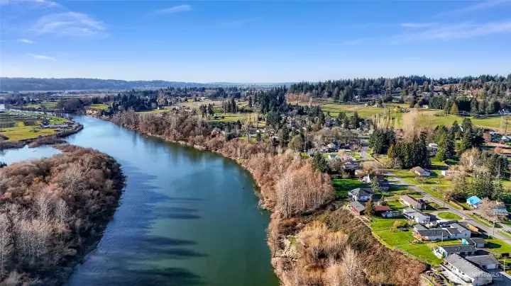 Discover the rare combination of privacy, space, & breathtaking scenery in this charming high-bank riverfront home set on 1.6 acres in the heart of Snohomish. A circular driveway welcomes you home, offering ample parking & room for RVs, boats, & future shop potential. Inside, the expansive living room flows seamlessly into the dining area & updated kitchen, creating an inviting layout designed for gatherings. Brand new flooring & fresh interior & exterior paint deliver a crisp, move-in-ready feel. 2 additional bedrooms & updated ¾ guest bath provide flexibility for guests, home office space, or hobbies. The dedicated laundry room with utility sink adds convenience & the washer & dryer convey. The primary suite is a true retreat, featuring a barn door entry to fully updated en-suite bath with walk-in shower & spacious walk-in closet. Step outside to the covered back deck with Snohomish river access & take in panoramic Snohomish Valley & river views overlooking the fully fenced yard. Enjoy evenings around the firepit, garden with fruit trees & blueberry bushes, entertain, or simply relax in your private outdoor haven. 2 sheds provide extra storage & the property offers endless possibilities for expansion or customization. Heat pump & AC installed in 2022. Minutes to downtown Snohomish, this riverfront dream delivers country tranquility with everyday convenience. If you are seeking acreage, views & room to grow in a prime Snohomish setting, this property deserves your attention.