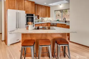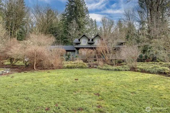 A private, gated drive introduces a serene, quintessential Pacific Northwest retreat set across nearly five lush acres. Mature, verdant landscaping envelops the property, providing exceptional privacy and a tranquil sense of arrival. Thoughtfully curated grounds with fruit trees, a rain garden, and an artfully spiral inspired garden create a landscape that feels both intentional and deeply connected to nature. Indoor outdoor living is beautifully realized with a massive wraparound deck overlooking the mossy, wooded setting, ideal for entertaining or quiet relaxation. Inside, the fully updated custom home blends refined finishes with modern comfort, featuring tall ceilings, fresh interior paint throughout, quartz countertops, and an appliance package to a chef’s delight. Newly installed heat pumps offer efficient heating and cooling, while a soapstone pellet stove adds warmth, ambiance, and character. Recent improvements including a new roof provide added peace of mind. Elevated details such as window seats, built ins, and bespoke custom touches reflect a level of craftsmanship and pride of ownership rarely found. With two bonus rooms and a four bedroom approved septic, the home offers excellent flexibility and future potential. Peaceful, private, and impeccably maintained, this is a rare opportunity to own a true Northwest sanctuary where thoughtful design, modern living, and natural beauty exist in perfect harmony.