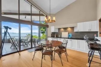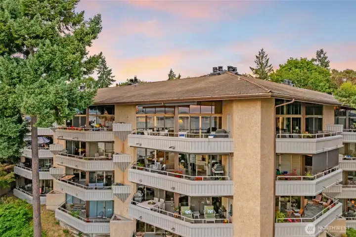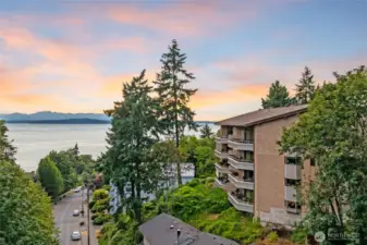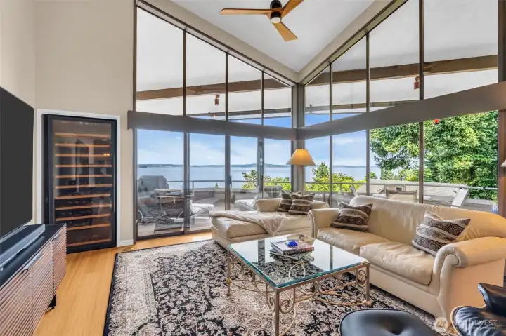 Located in the desirable Seaview Terrace community of West Seattle, this rare top-floor 3-bedroom penthouse offers a peaceful escape with sweeping views of Puget Sound and the Olympic Mountains. A spacious covered deck and double sliding doors seamlessly connect the kitchen and living room, creating effortless indoor-outdoor flow ideal for entertaining. Inside, floor-to-ceiling windows and vaulted ceilings fill the space with natural light, while a cozy gas fireplace and warm bamboo floors add inviting charm. A custom 280-bottle wine fridge is a standout feature for collectors and hosts alike. Community amenities include an outdoor pool, hot tub, sauna, fitness room, and a charming historic cabana. The home also comes with two storage units and two covered parking spaces for added convenience.