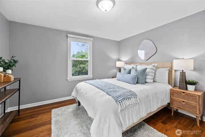 Welcome home to a special in-city escape. This beautifully updated Cape Cod bungalow sits on a large, fully fenced corner lot surrounded by garden spaces and mature landscaping. Offering efficient single-level living, this 2-bedroom, 1-bath home has been thoughtfully updated throughout. The remodeled kitchen is a true showpiece, featuring sleek cabinetry, open shelving, Kasker quartz countertops, stainless steel appliances, and durable marmoleum flooring. Similar updates enhance the adjacent dining area and utility room for a cohesive, uniquely modern, yet timeless charm feel. The inviting living room showcases a cozy wood-burning fireplace and original oak hardwood floors which flow throughout the living spaces. Step outside to a large, covered entertainment deck, and your own private oasis — a spacious yard filled with garden beds, open spaces, a detached garage & additional off street parking. Perfect for relaxing, entertaining, or simply enjoying the surroundings. You’ll fall in love with this home’s blend of charm, comfort, and smart updates — all nestled in a friendly neighborhood with a prime, convenient location.