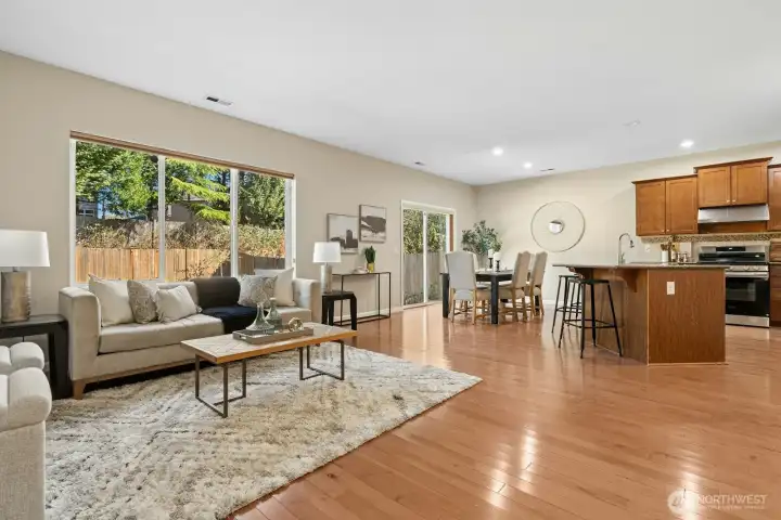 Rare oversized backyard sets this Kensington Park home apart—offering exceptional outdoor space w/ an extended patio, perfect for entertaining, relaxing, or play. Inside, enjoy hardwood floors throughout the lower level & a bright, open layout. The kitchen features SS appliances, granite slab countertops, gas cooktop, & pantry, flowing seamlessly into the dining & living areas anchored by a cozy gas fireplace—creating a warm, light-filled gathering space. Built by D.R. Horton, this thoughtfully designed home offers both comfort & functionality. Upstairs includes a spacious primary suite w/ walk-in closet, convenient upstairs laundry, plus 2 guest bedrooms & a full bath. A versatile media/office nook adds flexible space for work or hobbies. 2-car garage w/ vertical storage shelving completes the home. Freshly painted interior. Located in North Bothell, close to shopping, dining, schools, freeways, & Tambark Creek Park/playground.