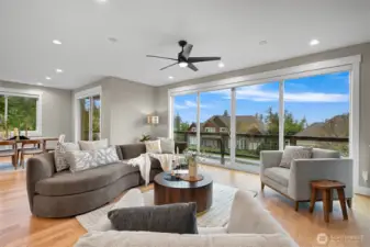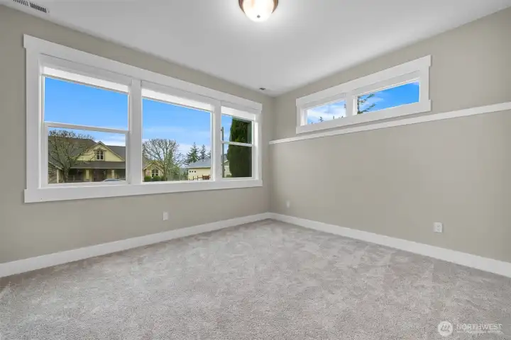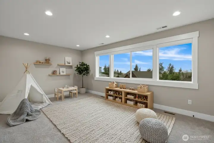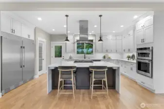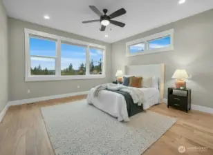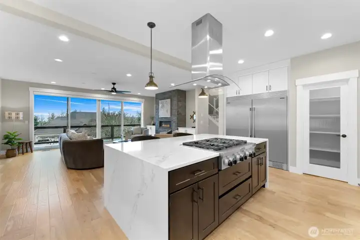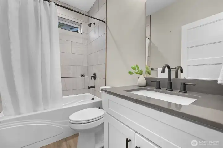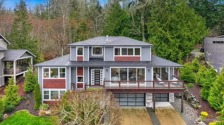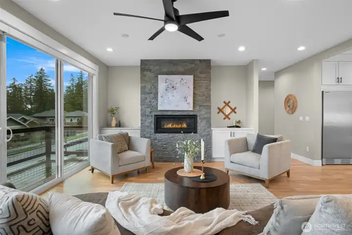 Step into this contemporary masterpiece in Bellingham's coveted South Side. The open-concept design boasts soaring 12-foot ceilings, a chef’s kitchen with a stunning 7-foot quartz waterfall island, commercial-grade appliances, and a spacious walk-in pantry. A covered deck off the kitchen overlooks a private backyard with BBQ hookups and stairs—ideal for year-round entertaining.The main floor features a tranquil primary suite with a spa-like ensuite and walk-in closet, a cozy living room with a gas fireplace, a dedicated office, and a convenient laundry room. Upstairs, you’ll find two spacious bedrooms—one with serene bay views—and a guest bath with quartz countertops and a tiled shower/tub. The lower level offers versatility with a bedroom, full bath, kitchenette, and an impressive media room.The 1,129-square-foot, extra-deep 3-car garage is a dream, complete with clear garage door panels for abundant natural light—perfect for storage or hobbies. Beyond the home, adventure awaits with Samish Trail access right outside, plus Galbraith Mountain, Lake Padden, and top-notch shopping and dining just minutes away. This property blends luxury, functionality, and an unbeatable location—truly a rare find!