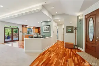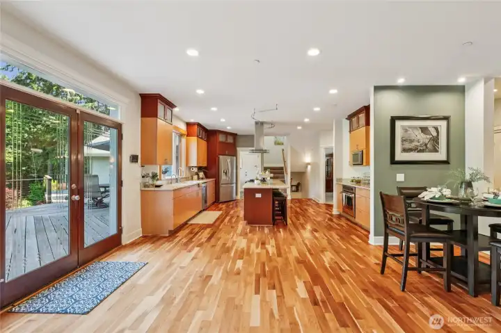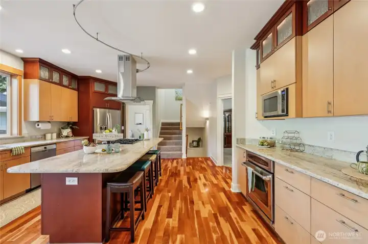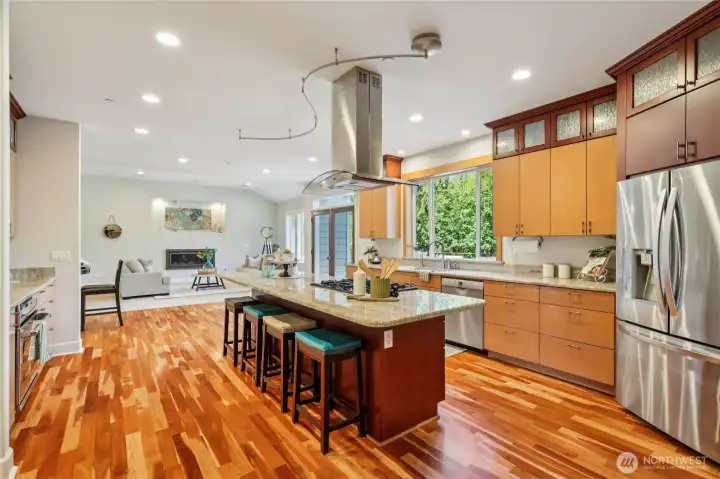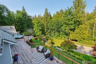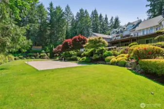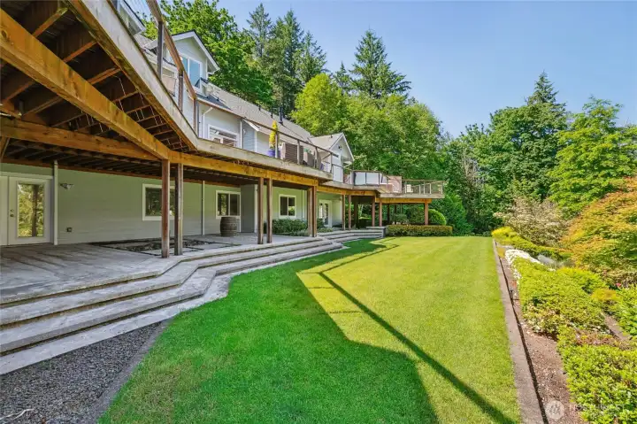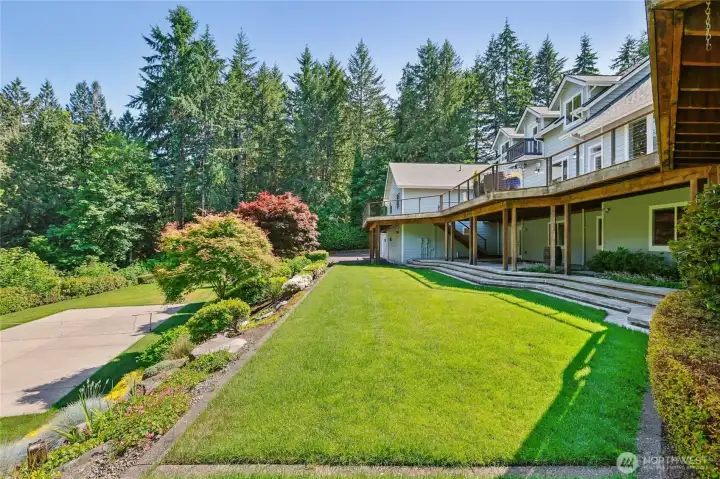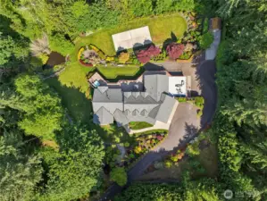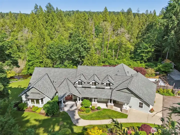Gorgeous acreage property with multigenerational living & 826sf of garages plus opportunity for short term rental. Meander through the trees to this breathtaking property. Covered wrap around porch guides you into the open & bright great room with walls of windows overlooking the trees. Primary suite on main with walk in shower & access to hot tub. Gracious office with built-ins. Chef's kitchen with granite counters. Bonus room & extra finished rooms. Lower floor features wet bar, wine room & 2 full baths. 1 bd/1 bath attached apartment with no stairs. Radiant in-floor heating in main house. Nearly 2000sf of iron wood decks overlook ponds, everchanging landscaping & sport court! (2) garages=6 cars. RV parking w/hookup.
