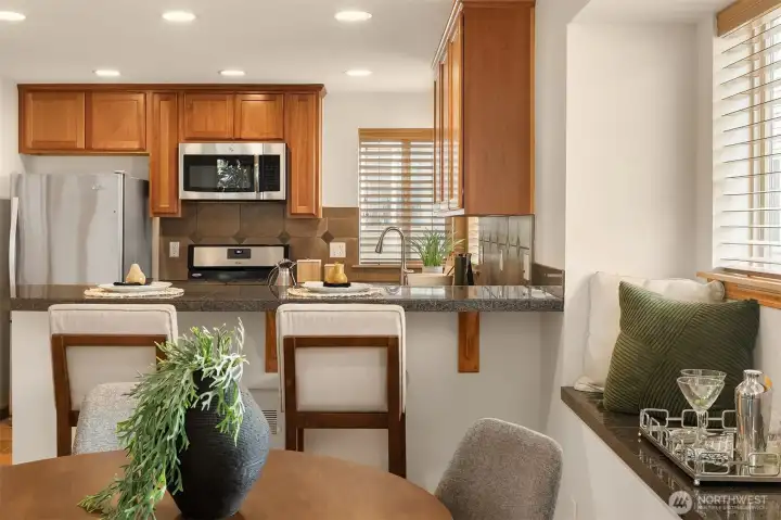 A commuter's dream, this luxuriously appointed, move-in ready, end-unit townhome with NO HOA DUES is a rare & affordably priced lucky find! With 1,175sf, 3 bedrooms, 2 baths, attached garage & epic fenced-in yard complete with a gorgeous magnolia tree, you'll love the vibe & feel right at home in your stunning new abode. Light & bright with newly refinished bamboo hardwoods, fresh paint & abundant windows throughout. Upper floor main living spaces create a sense privacy & added security. Open concept layout features living room with gas fireplace & covered balcony, dining room with window bench seating & showcase granite kitchen with warm, solid wood cabinetry, gas stove, upgraded stainless steel appliances & sprawling peninsula breakfast bar. Lofty top floor with tall vaulted ceilings features primary bedroom with walk-in closet & ensuite bath with skylight + 2nd bedroom, gorgeous full bath & full-size utility room. Ground floor 3rd bedroom with backyard access makes an ideal home office hideaway. Efficient hydronic radiant heating with on-demand tankless hot water. Abundant storage & loads of closet space. Ultra convenient location with rapid transit access + parks, shops & dining at your doorstep!