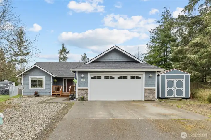 Designed for comfort and everyday living, this 3-bedroom, 1.75-bath home offers 1,440 square feet of thoughtfully planned space. From the moment you walk in, the vaulted ceilings and generous natural light create an inviting, open atmosphere. A striking stone fireplace anchors the main living area, adding warmth and style.The kitchen is both functional and elegant, featuring solid stone countertops, stainless steel appliances, and easy access from the dining area to the outdoor deck — ideal for gatherings or quiet evenings outside. The primary bedroom includes its own deck access and a spacious walk-in closet. Enjoy watching local wildlife, including bald eagles soaring overhead, deer passing through, and raccoons exploring the area.You’ll also appreciate the tiled bath finishes, energy-efficient tankless hot water system, whole-home water filtration, durable waterproof flooring, and a spacious two-car garage, and shed.