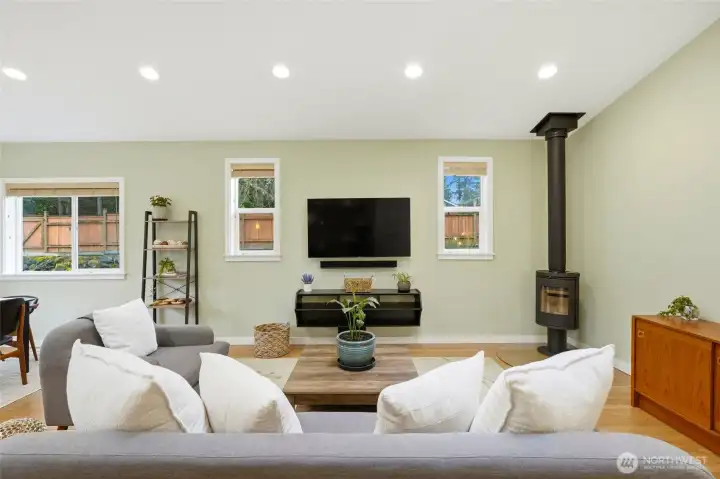 Enjoy single-level living with thoughtful upgrades in this charming rambler. A spacious renovation added a generous family and dining room with vaulted ceilings, oak flooring, and a cozy wood-burning stove adjacent to the beautifully updated kitchen. The remodel also includes a large fourth bedroom for added flexibility. A slider off the dining area opens to an expansive patio and a sunny, fully fenced private backyard. In addition, the backyard features a spacious, fully finished studio, perfect for a home office, creative studio, fitness space, or a private retreat for guests. The living room showcases hardwood floors, a brick fireplace, and large windows overlooking the landscaped front yard with planter boxes ideal for flowers, herbs, or vegetables. Three additional bedrooms also offer hardwood floors and fresh paint!. The primary suite is privately positioned at the back of the home and includes backyard views, fresh paint, and a full bath. Located in a well-established neighborhood within the Edmonds School District and close to amenities and the beach, this home combines comfort and charm.