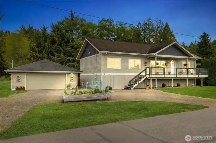 Welcome to your Olympic Peninsula retreat in the heart of Squamish Harbor—where every day feels like a getaway just across the Hood Canal Bridge. With over $200K in recent thoughtful updates, this beautifully refreshed single-level home offers soaring 9’ ceilings, luxury LVP flooring, slab quartz & granite counters, stainless appliances, and a spa-inspired 5-piece bath. Relax on the TREX deck and take in serene water, Sound, and mountain views as otters play and kayakers glide by. Beach access, a waterfront park, and a private boat ramp are just across the street—making boating, crabbing, and paddleboarding part of your everyday rhythm. Thoughtfully elevated to maximize views and designed to accommodate changing water levels, this home blends comfort with long-term peace of mind. Situated on over 1 combined acre you are surrounded by mature trees & lush vegetation creating a peaceful oasis as a backdrop for the sounds of local birds. The property has a regularly maintained 2 bedroom-septic system while the home has 3 defined sleeping areas. The expansive 5-car detached garage plus shed provides exceptional space for vehicles, boats, and all your adventure gear. Come experience truly magical Pacific Northwest living.
