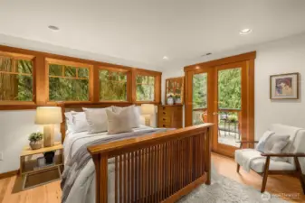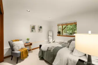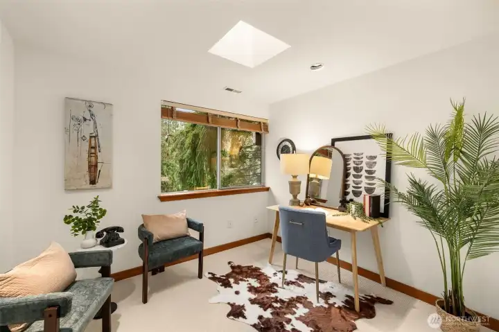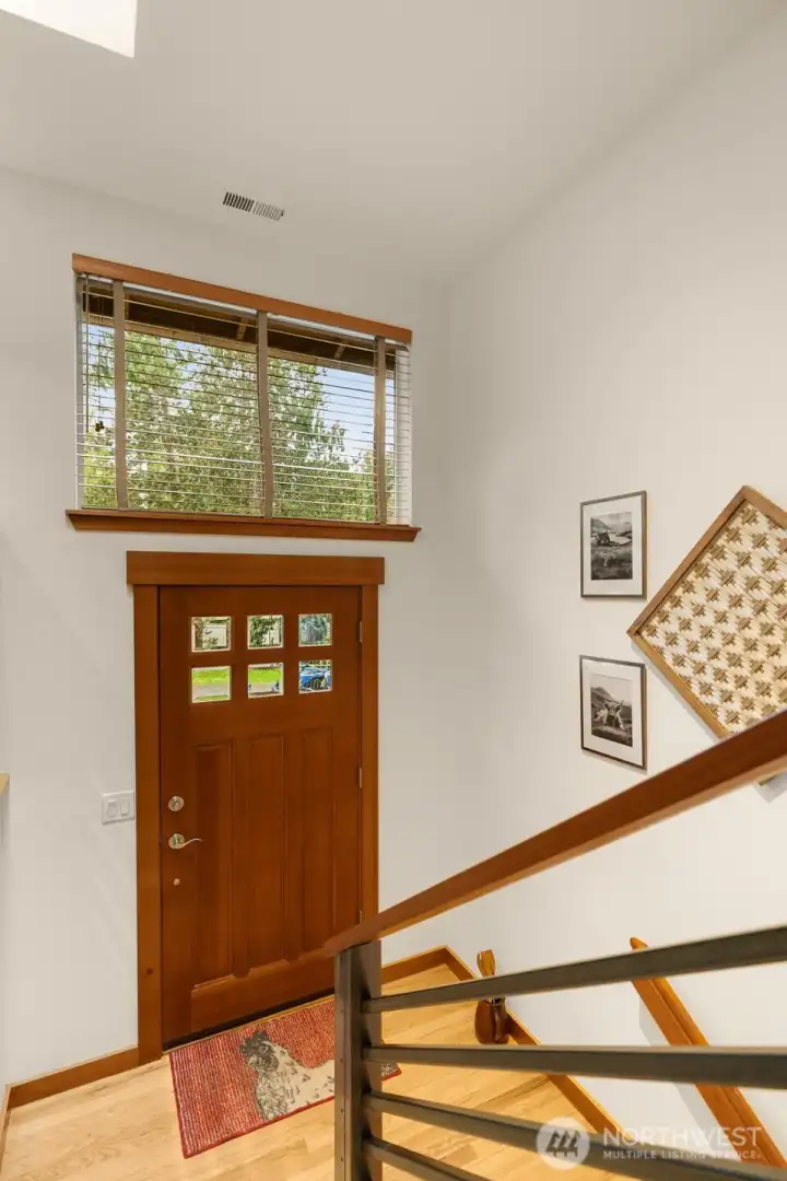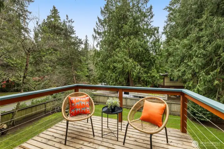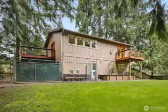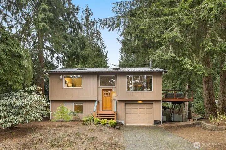 This private Redmond home is tucked away on a quiet street surrounded by green views. Natural light pours in through skylights and high end wood framed windows, highlighting hardwood floors, new carpet, and a cozy wood burning stove. The large deck off the living room creates seamless indoor outdoor living and extends your entertaining space into a natural setting. The spacious kitchen features a generous island, high end stainless steel appliances and abundant cabinetry, ideal for both everyday living and gatherings. Upstairs you will find two bedrooms and a full bath with a deep jetted tub, including a primary suite with a walk-in closet and its own private deck. The lower level offers two additional bedrooms and a full bath, plus smart storage under the stairs and a 1 car garage. An expansive backyard provides the perfect setting for entertaining or quiet relaxation. A dedicated exterior dog run adds a convenient and secure space for your furry friends. Conveniently located near Redmond Town Center, parks, trails, Microsoft and the new Eastside light rail, this home offers peaceful living with exceptional access to everything the Eastside has to offer.