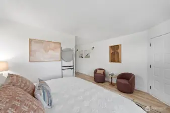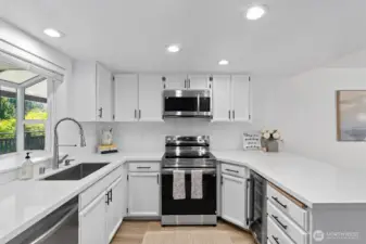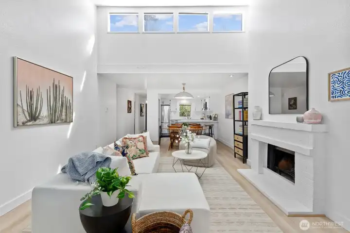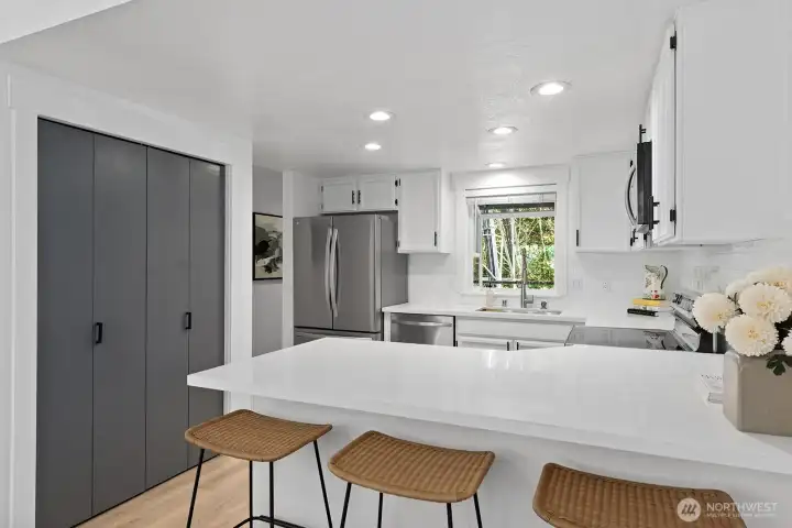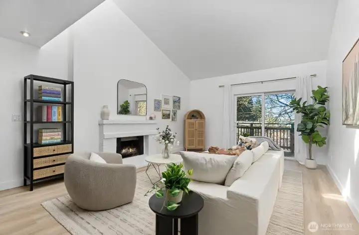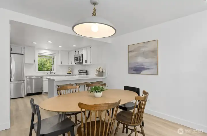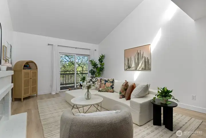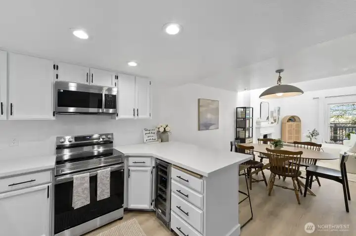 Perched on the top floor, this freshly remodeled turnkey 2-bedroom, 1.75-bath home offers 1,271 square feet of light-filled, elevated living. Vaulted ceilings enhance the open, airy feel while drawing in an abundance of natural light. Thoughtfully updated with a fresh, modern aesthetic, this home features a reimagined kitchen with new stainless steel appliances, and quartz countertops with peninsula seating for casual eats. Additional renovations include engineered hardwood floors, new interior light fixtures, fresh interior paint, and beautifully renovated bathrooms with designer tile, and new vanities. The spacious primary suite includes a generous walk-in closet, and abundant storage supporting effortless everyday living. Step outside and enjoy a lifestyle rooted in convenience and connection. Walk to neighborhood groceries, cafe's and coffee shops, or spend time exploring nearby parks and green spaces. Newport Hills Park is just moments away, while the scenic trails of Coal Creek Natural Area offer six miles of wooded paths to unwind and recharge. You will love this stunner, where modern comfort and everyday ease unite seamlessly! Welcome home!