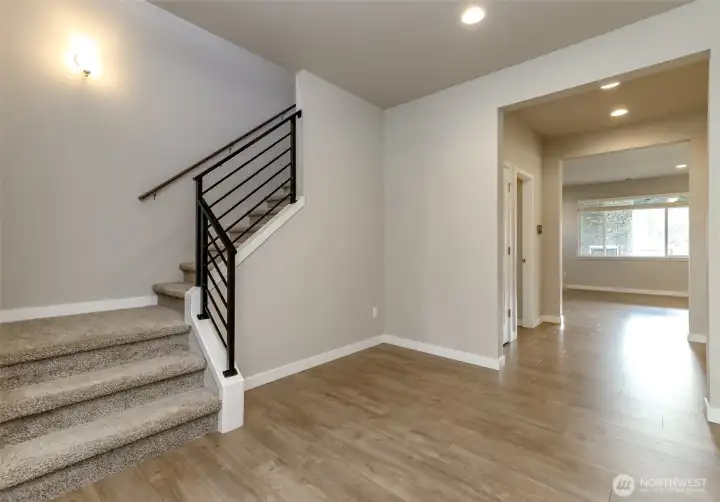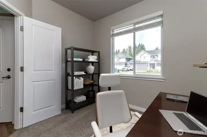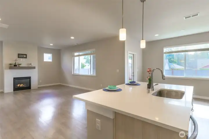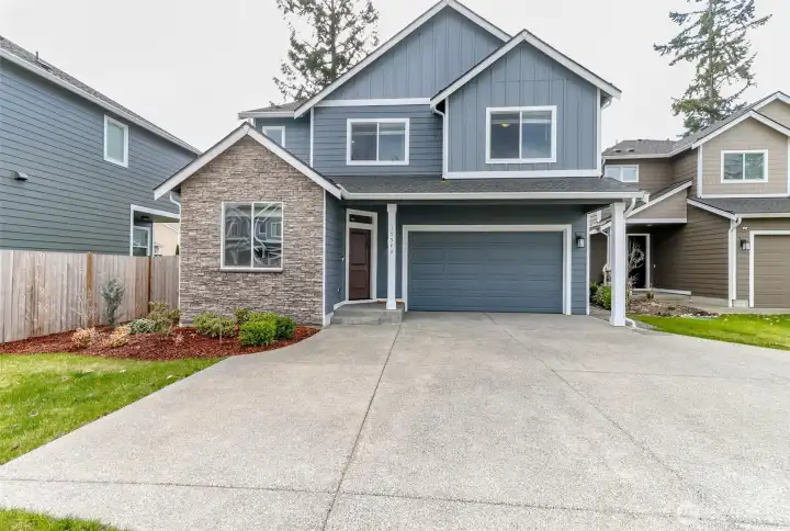 Welcome to your new home in the cozy community of Mill Pond in Yelm! Quality built in 2023 by Rush Construction, this 2604 sf 4 bed plus den/office has everything you need. The main floor features a great room concept complete with cozy gas fireplace with a lovely surround, a chef's kitchen, large quartz island with room to enjoy a meal and serve your guests, a gas range, walk in pantry, and breakfast nook which leads to your covered patio with gas fireplace and fully fenced yard. You will appreciate the home office/playroom/den on the main floor as well as a roomy foyer. Upstairs features a private main ensuite large enough for all of your furnishings, a barn door leading to the bathroom featuring a garden tub, large shower, water closet, double sinks w/quartz countertops and quality cabinetry as well as a walk in closet. Laundry and 3 more bedrooms round out the second floor. Heat pump and Central Air Conditioning to heat and cool your home efficiently! Outside you will enjoy and appreciate the large fully fenced and level back yard with room to play and garden. The community has walking trails and a park next door. Close to shopping, JBLM, movies, parks and trails make this home ideal!