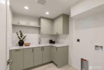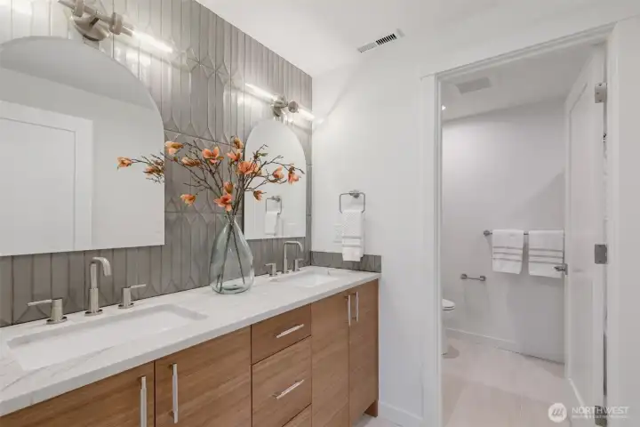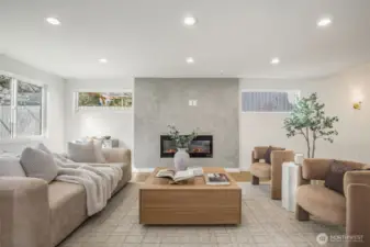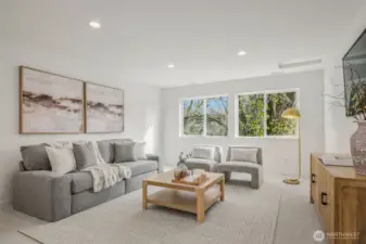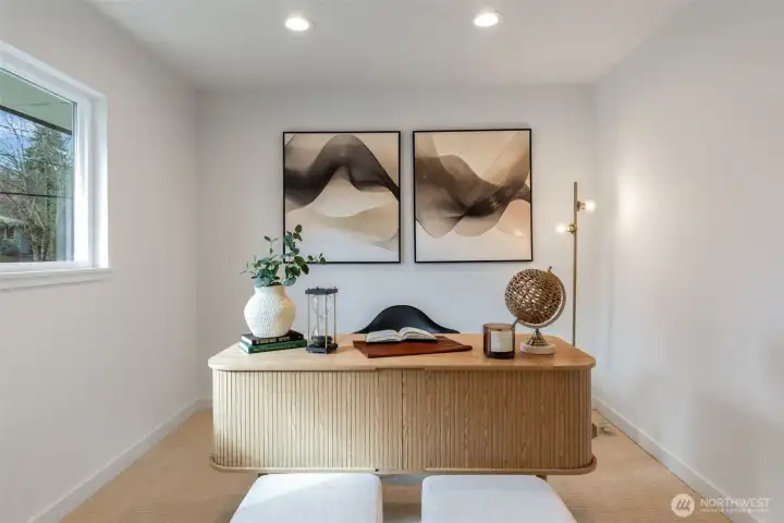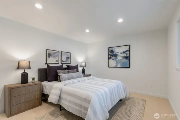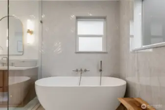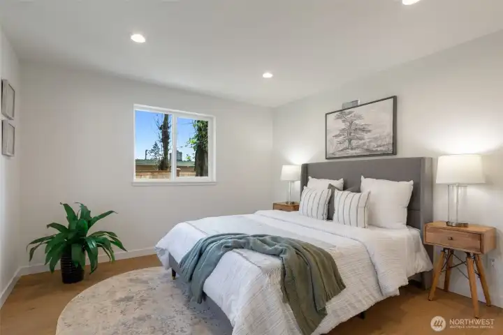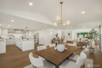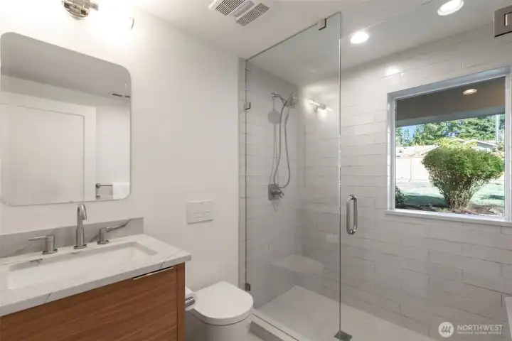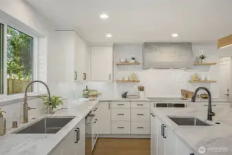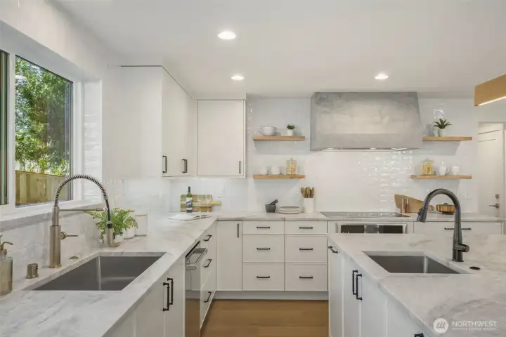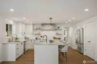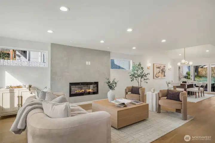 Stunning, fully permitted studs-out remodel showcasing exceptional craftsmanship, curated design, & a thoughtfully reimagined floor plan. White oak hardwoods flow seamlessly throughout the main level, complemented by a custom wrought iron staircase that sets a refined, sophisticated tone. Designed for both flexibility & elevated living, the home features two primary suites, including a main-level bedroom ideal for multi-generational living. Offering 5 beds, 4 baths, a dedicated office, bonus room, & dual laundry rooms, the expansive 3,400+ sq ft layout provides generous, well-appointed spaces. The luxurious primary suite is a true sanctuary, featuring a large, walk-in tiled shower, soaking tub, frameless glass, rich walnut cabinetry, & quartzite countertops. Additional bathrooms echo this elevated design with refined finishes & thoughtful detail. A calming plaster-finished fireplace anchors the main living area, flowing effortlessly into the dining space & chef’s kitchen, complete with custom cabinetry, quartzite countertops, GE Café appliances, designer lighting, open shelving, and a spacious walk-in pantry. Enjoy year-round outdoor living on the covered back deck. All major systems have been upgraded, including a new roof, gas furnace, heat pump, & hybrid water heater. Ideally located within the Bellevue School District, just moments to Phantom Lake, parks, shopping & easy access to I-90, 520, and major employers.