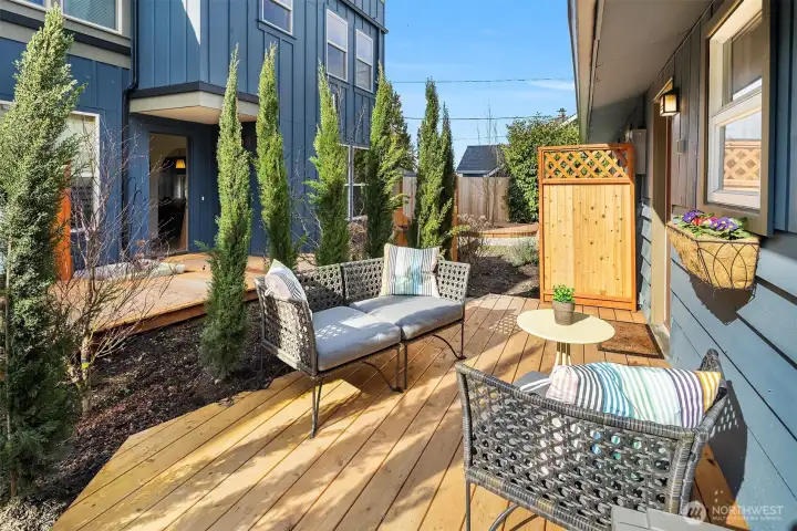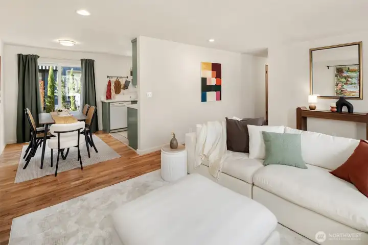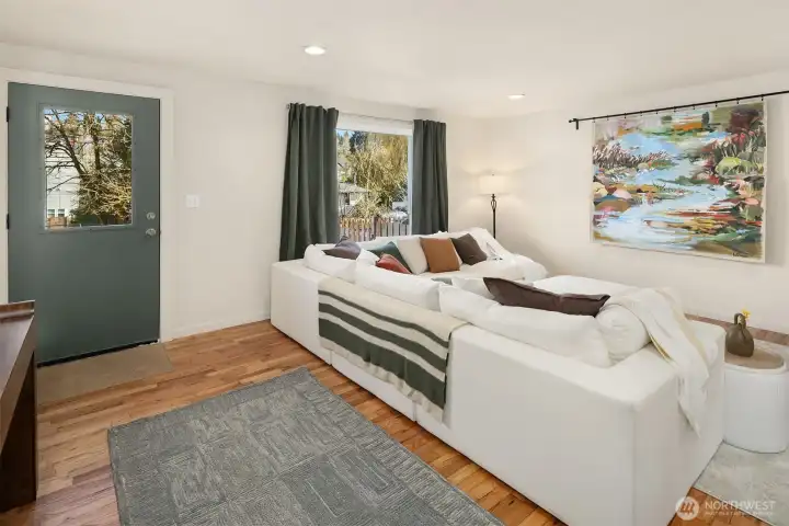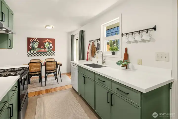 Thoughtfully updated and beautifully staged home offering easy one-level living in the heart of Delridge in West Seattle. A fully fenced front yard and welcoming entry path create a charming first impression, while the newly built deck and private patio provide ideal spaces for relaxing or entertaining. Inside, the light-filled living room features warm hardwood floors and an open layout that flows seamlessly into the dining area. The updated kitchen showcases quartz countertops, stainless steel appliances, custom green cabinetry, and generous workspace, creating a functional and stylish hub for everyday living. Two spacious bedrooms offer comfortable retreats with large windows and hardwood floors. Outdoor living is a highlight with multiple seating areas, landscaped plantings, and a private deck surrounded by greenery, creating a peaceful setting for everyday living or hosting guests. Enjoy the perfect balance of residential calm and city accessibility.