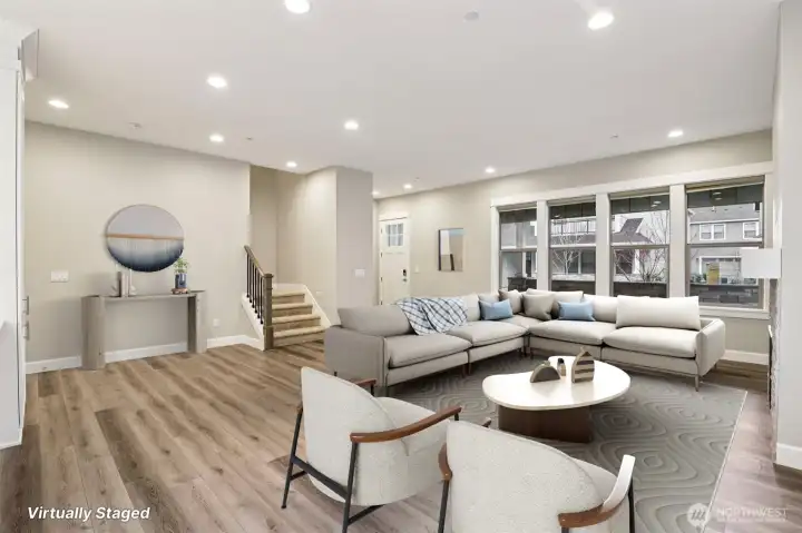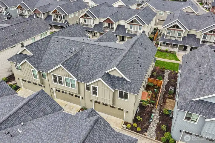 Refined living in the gated community of Two Creeks at Camas Meadows. Thoughtfully designed with expansive living spaces, 10-foot ceilings, and 8-foot doors throughout. A welcoming covered front porch and private two-car alley-access garage enhance both charm and convenience. Wood flooring spans the main level, with carpeted stairs for comfort. The side yard, largest in the community, offers a covered patio and mature landscaping—ideal for quiet mornings or curated garden touches. Upstairs, the primary suite impresses with vaulted ceilings, dramatic floor-to-ceiling windows, a generous walk-in closet, and a well-appointed ensuite. Two additional bedrooms, each with walk-in closets, accompany a functional laundry room complete with storage and utility sink. Residents enjoy premier amenities including pickleball courts, a fitness center, outdoor pool, saunas, hot tub, and meeting space. Direct access to the Lacamas Heritage Trail and effortless proximity to Camas Meadows Golf Course.