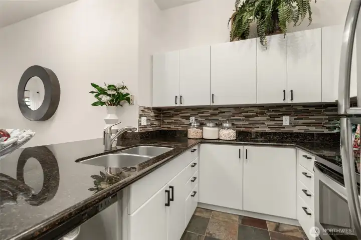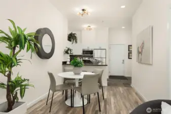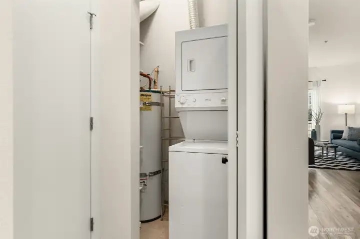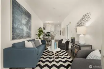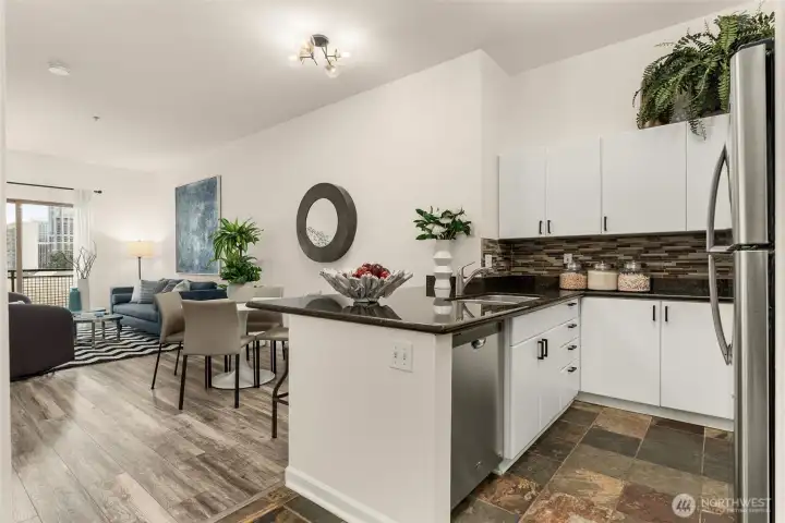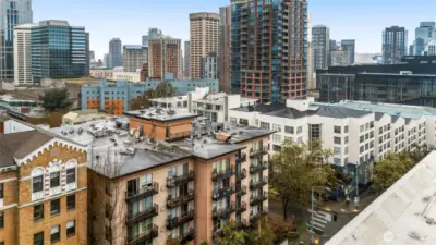 Perched on the top floor in the heart of First Hill, this inviting condo offers beautiful city views and an unbeatable central location. Enjoy easy access to the best of Seattle with downtown, South Lake Union, and Capitol Hill just moments away - easy access to dining, entertainment, and much more. Inside, the unit features stunning lofted ceilings and a spacious kitchen with ample storage and prep space that flows comfortably into the living area. Sliding windows usher you to your own private patio with sweeping skyline views and a peek at the Sound. Imagine the sunsets in this west facing unit! Everyday convenience is covered with an in-unit washer and dryer, bike storage, gym and a dedicated parking space in the building’s secure garage. Just across the hall from this unit you'll find access to the rooftop, one of the building’s standout amenities—an expansive gathering space with city and territorial views, perfect for entertaining or relaxing above the city.