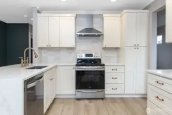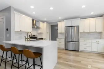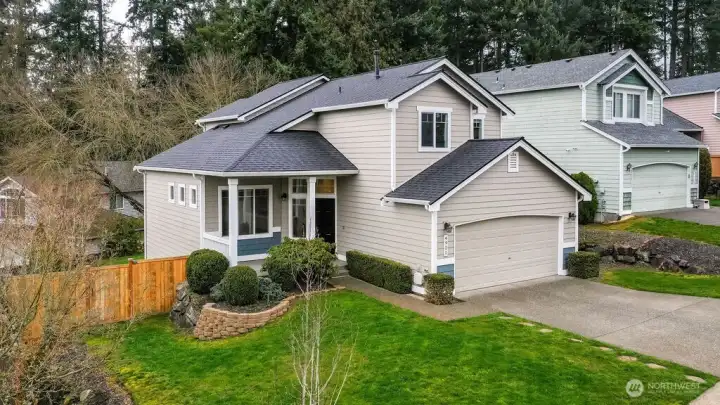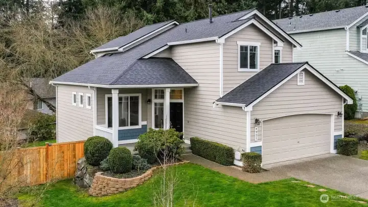 Welcome to this Splendid Lakeland Hills Home! This is a MUST SEE! A lovely covered porch upon entry! Inviting foyer greets you with 2 story vaulted ceilings & modern railing staircase. Semi-open floor plan with Living Room/Dining Room, and cozy family room w/gas fireplace off kitchen. Gorgeous remodeled chef's kitchen with quartz counters, soft-close cabinets, designer hardware, luxurious backsplash tile, waterfall peninsula, and powerful range hood. All appliances stay! New LVP flooring throughout main level, stairs & hallways. Tastefully updated bathrooms! New doors, trim, & baseboards. Large Primary Suite with ensuite bath & WIC with custom built-ins. New furnace and A/C installed in 2018. Water heater replaced in 2024. Fresh exterior paint Oct. 2025. Brand NEW ROOF just installed in 2026! Fully fenced backyard with TREX deck, cedar railing & storage shed. Wonderful location near parks, schools, trails, & Town Center. Close to Highways 167, 18 & Sounder commuter rail.