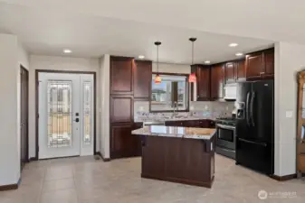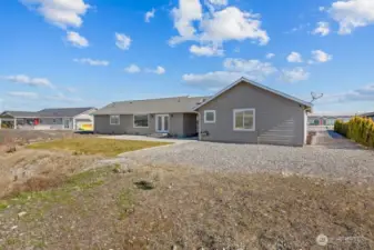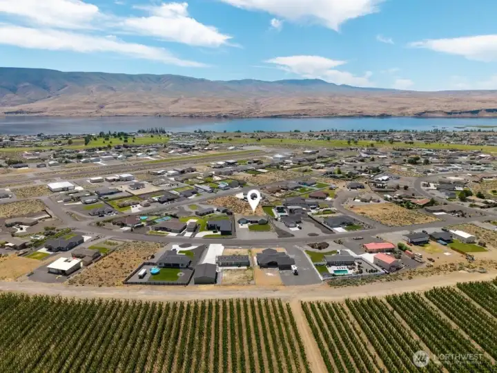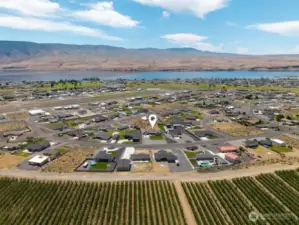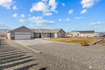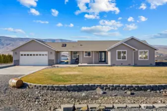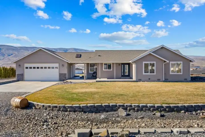 Bask in breathtaking Columbia River views from the air-conditioned comfort of this stunning Desert Aire rambler, set on an expansive 30,000+ sq ft lot with room to expand. The terraced front lawn welcomes you to a covered front porch featuring a beautiful tongue-and-groove ceiling detail. An oversized picture window fills the living room with natural light, while French doors open to a patio featuring a breezeway, skylights, and a built-in grilling station—perfect for entertaining. Vaulted ceilings and a great-room style layout offer flexible living and dining options. The kitchen features granite tile countertops, an island with an eating bar, and abundant storage. The primary suite includes vaulted ceilings, a ¾ en-suite bath, and a walk-in closet with built-in shelving. The full bath offers a tile-surround shower and spacious vanity for additional storage. A covered breezeway leads to the fully finished two-car garage, which includes a half bath, epoxy floors, and extensive built-ins. The property also offers RV parking with hookups and large gravel parking areas beside and behind the home. Desert Aire community amenities include golf, a swimming pool, airstrip, walking trails, and more offering a lifestyle as impressive as the view.