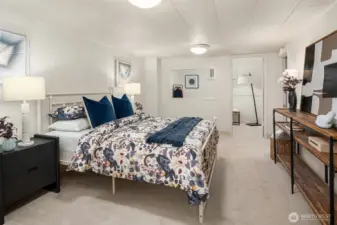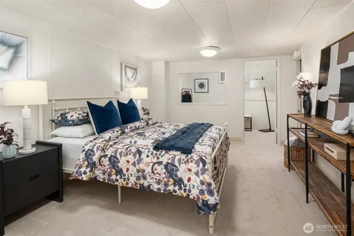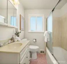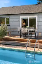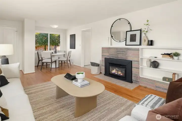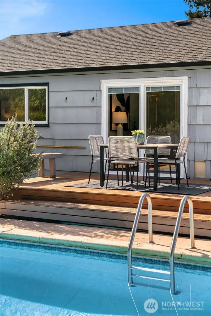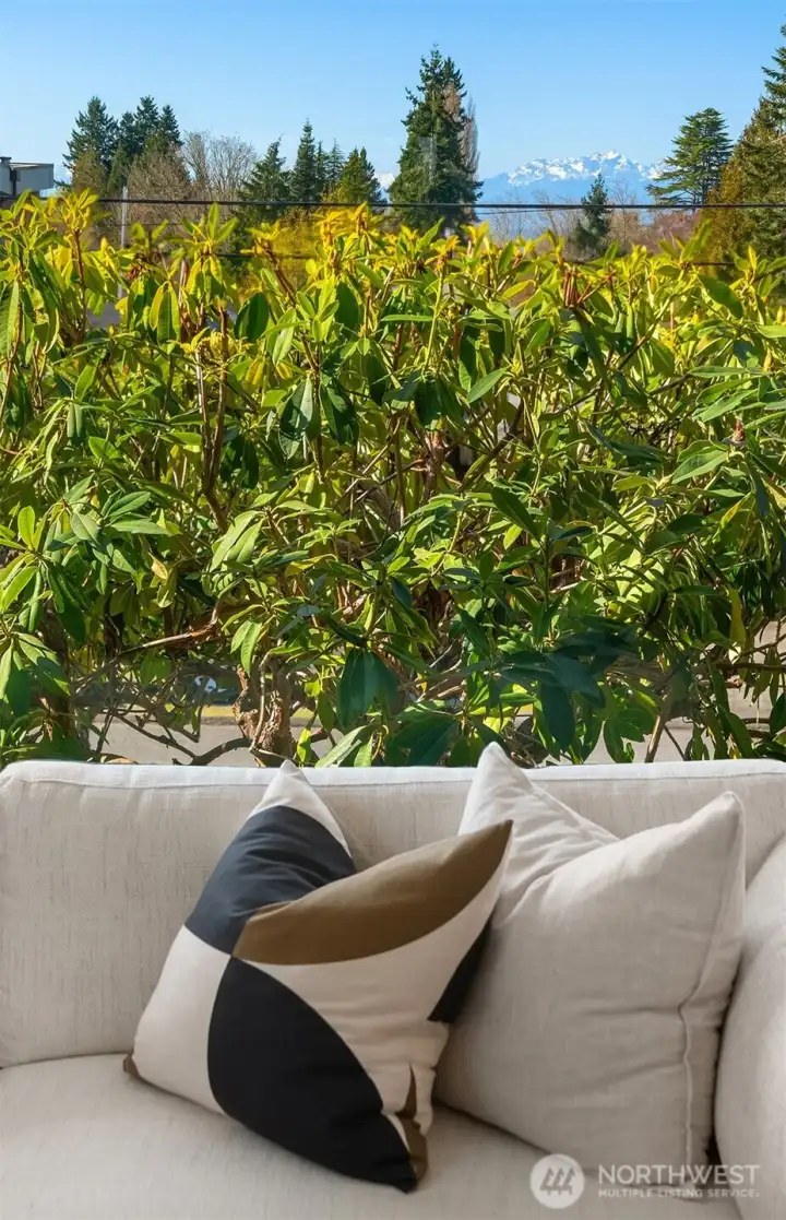 Set above a quiet, low-traffic street in one of Broadview's best locations, this west-facing home offers light, space, and privacy. It sits close to Carkeek Park with its trails, beach access, and Sound views. The elevated lot provides a sense of openness from the moment you arrive, with Olympic Mountain views on clear days, sunny afternoons, and stunning sunsets. Mature landscaping, a boulder-lined entry, and plenty of parking including a one-car garage round out the arrival. Inside, oak hardwood floors run through the living area, anchored by a gas fireplace with built-in shelving. A picture window fills the space with natural light. The kitchen and dining area are clean and functional, ready for daily life or a future renovation. Two well-sized bedrooms and a full bath share the main floor with a flexible third room that works as an office, sitting area, or bedroom, and opens to the backyard. Out back, a spacious deck leads to a fully functioning in-ground pool with an updated heater and pump for extended-season swimming. A chicken coop is ready for your flock, or remove it to expand the yard. The grounds are filled with roses, rhododendrons, lavender, and raised garden beds.The lower level has a large finished room with attached 3/4 bath(primary?), laundry, and unfinished space ideal for storage, a workshop, or future square footage. Mini-splits provide efficient year-round heating & cooling. Fresh paint, new carpet, newer roof, furnace, & water heater. Pre-inspected.