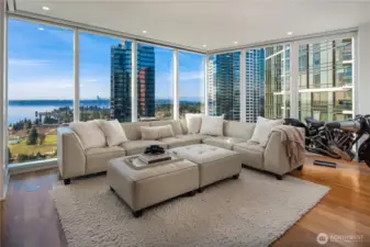 Discover Downtown Bellevue living at its best from this light-filled Bellevue Towers residence. Walls of windows frame western lake, park, Seattle city skyline & Olympic Mountain views. Two private, west-facing balconies for enjoying spectacular sunsets. The spacious floor plan boasts 2,120 sq ft, two bedroom suites, and a den/office. A huge pantry plus multiple closets offer abundant storage within the unit; a huge amenity for condo living. Two secure garage parking spots just steps to the elevator for the ultimate convenience. Bellevue Towers has all the best-in-class amenities you desire including beautiful common areas, fitness rooms, spa with sauna + steam room, outdoor terraces, lush urban gardens, 24-hour concierge, and newly renovated amenities. The Bellevue Collection, downtown park, eats, sips, and transit center with brand new light rail station are an elevator ride away.
